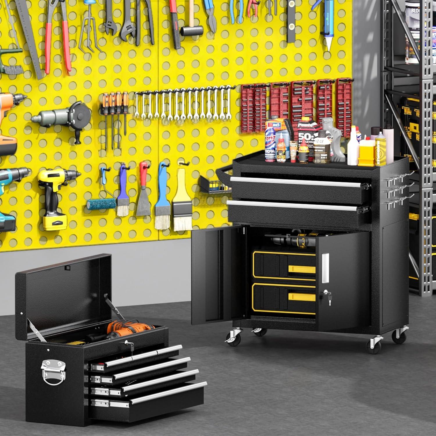 Greenvelly 7-Drawer Metal Tool Chest, Rolling Tool Chest with Wheels, Tool Cabinet with Top Pegboard and Hooks, Metal Tool Cart with Handle for Garage, Workshop, Warehouse (Black)(Black)
