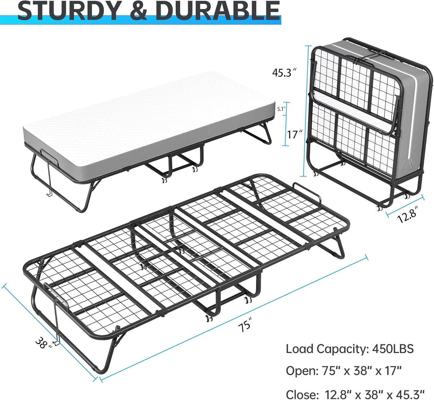 Built to Last: The metal folding bed with mattress designed with high-strength all-steel, that ensure to provide firm support without sagging, no noise or squeaks. Capable of supporting up to 450 pounds, this folding bed delivers rock-solid stability, ensuring a safe and sound sleeping experience for any gues