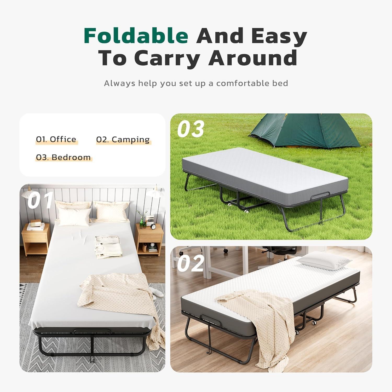 【Foldable and Movable】This rollaway bed with mattress is equipped with 4 locking casters that can rotate 360 degrees, making it easy for you to move around. Its folding function can better utilize space, allowing you to easily move and store in the closet, under the bed, or any corner. This folding bed is an ideal choice for vacation, camping, or RV travel.