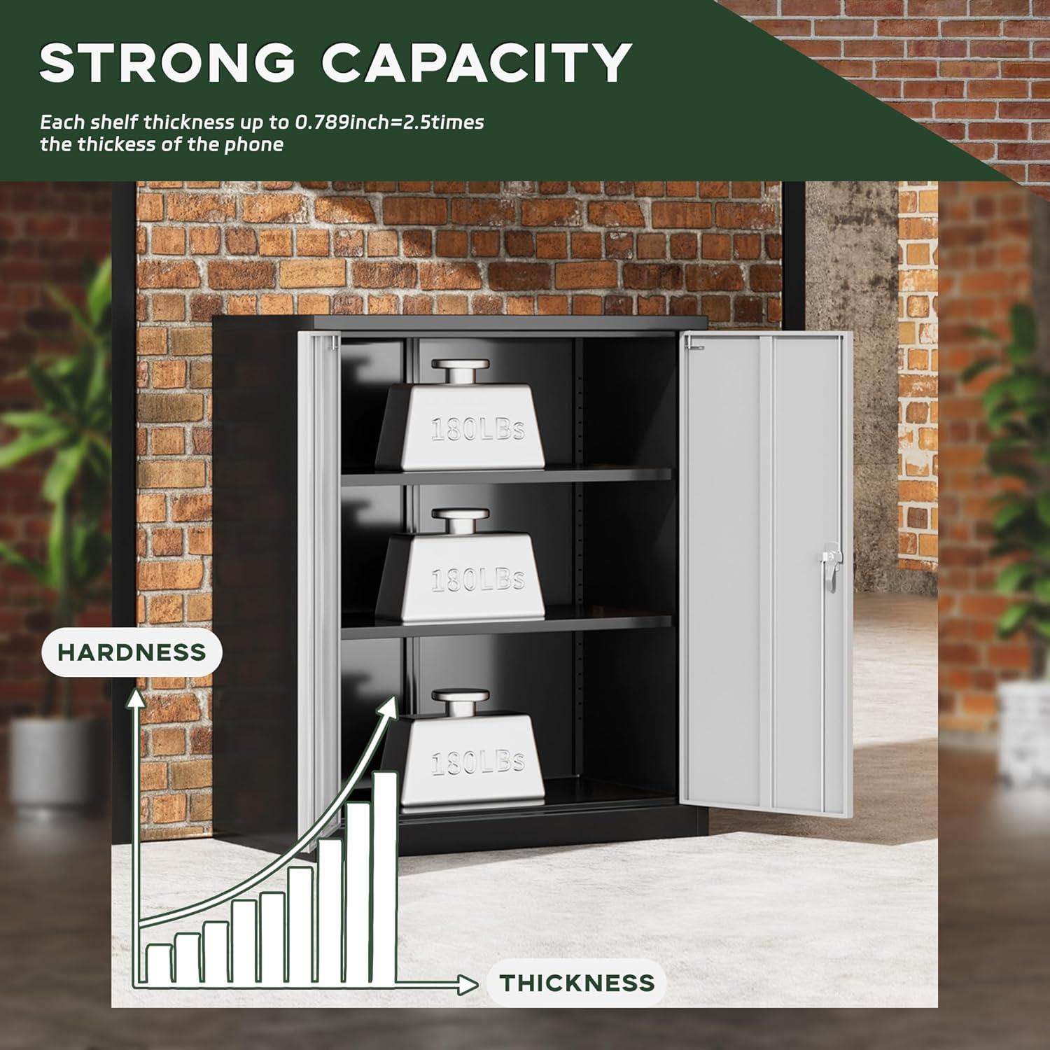 [Sturdy & Durable Material]:The metal storage cabinet is made of 0.8cm thickness cold rolled steel plate.Our small storage cabinet use multiple reinforcement designs in the structure and advanced painting processes on their surfaces, which make them good load-bearing capacity, corrosion resistance and easy cleaning characteristics.