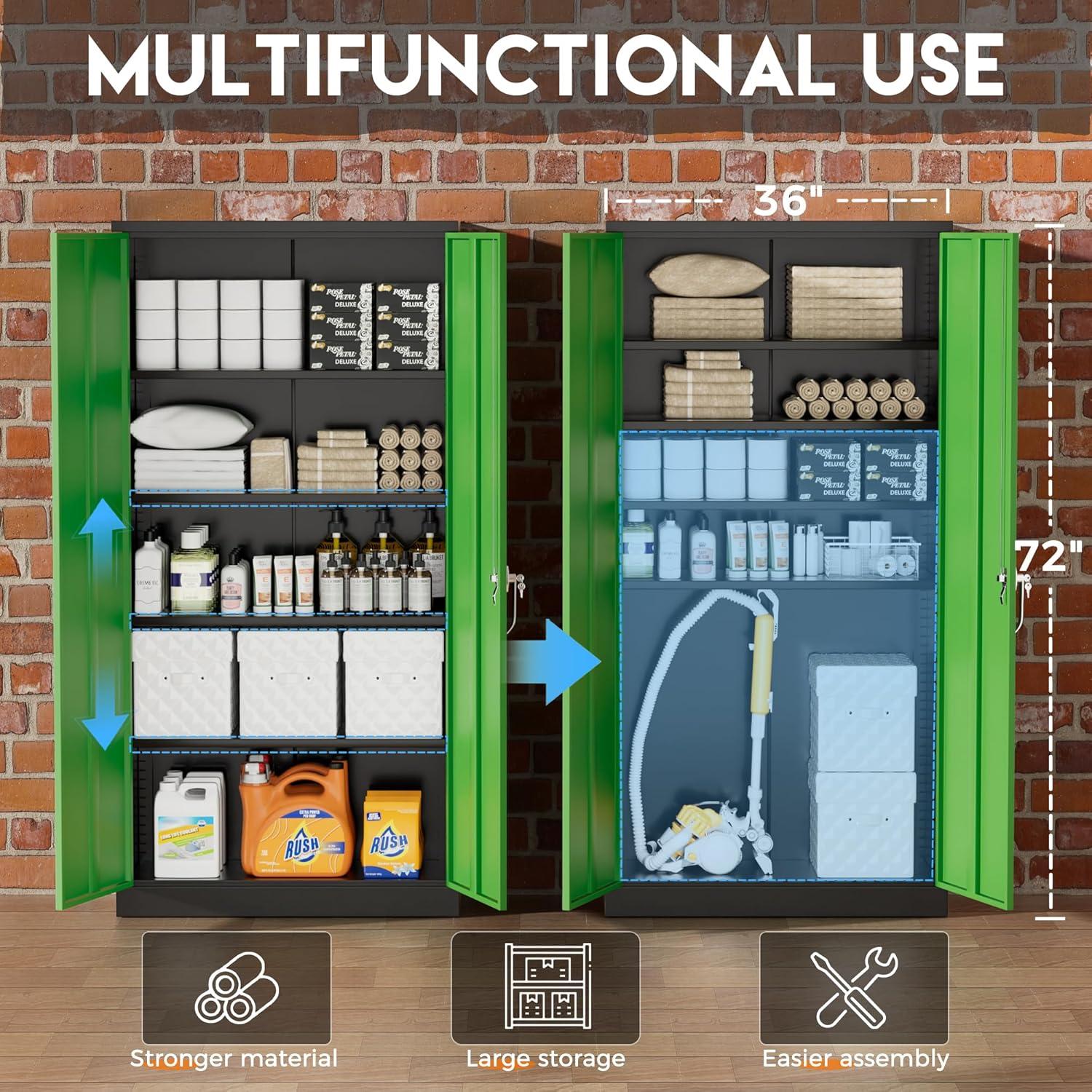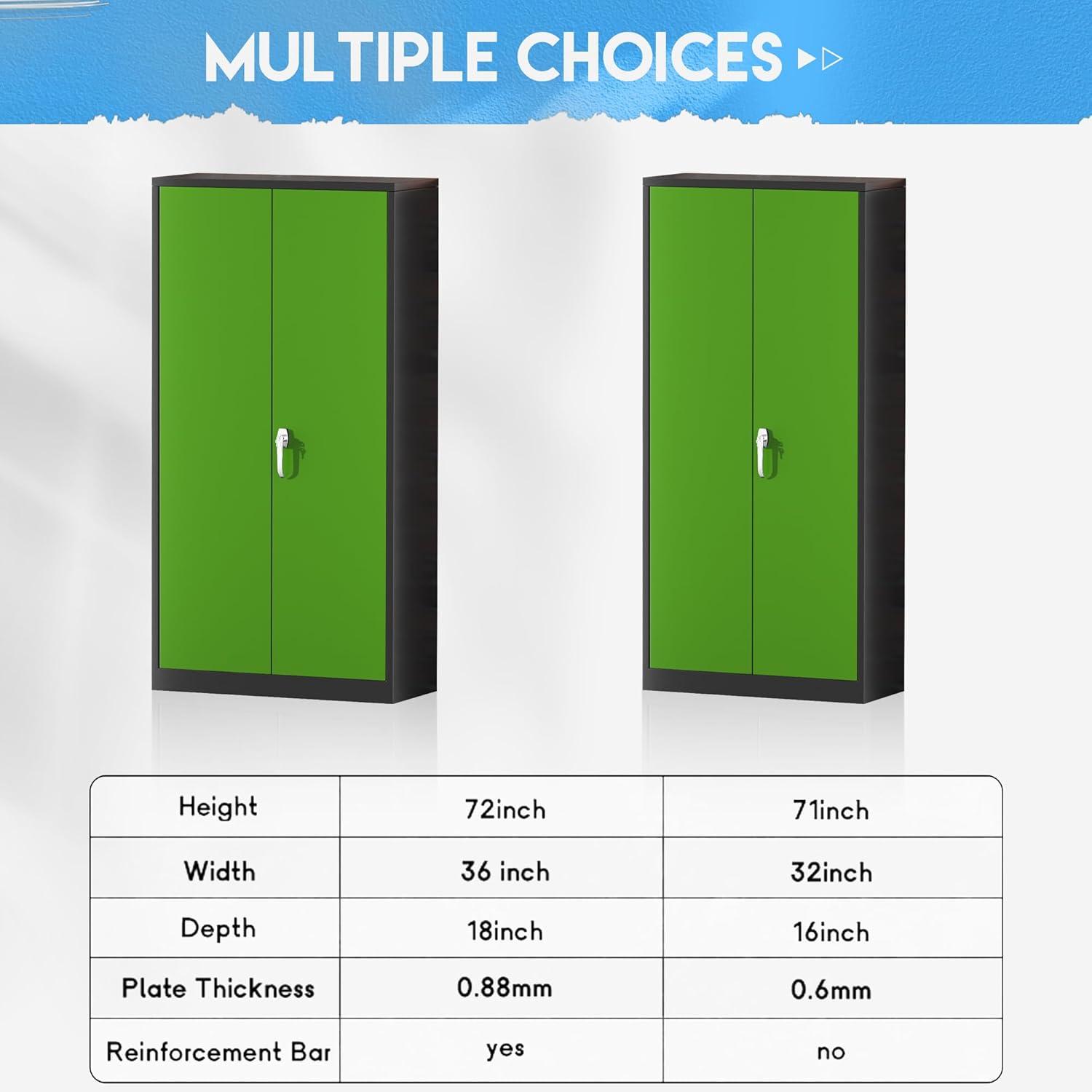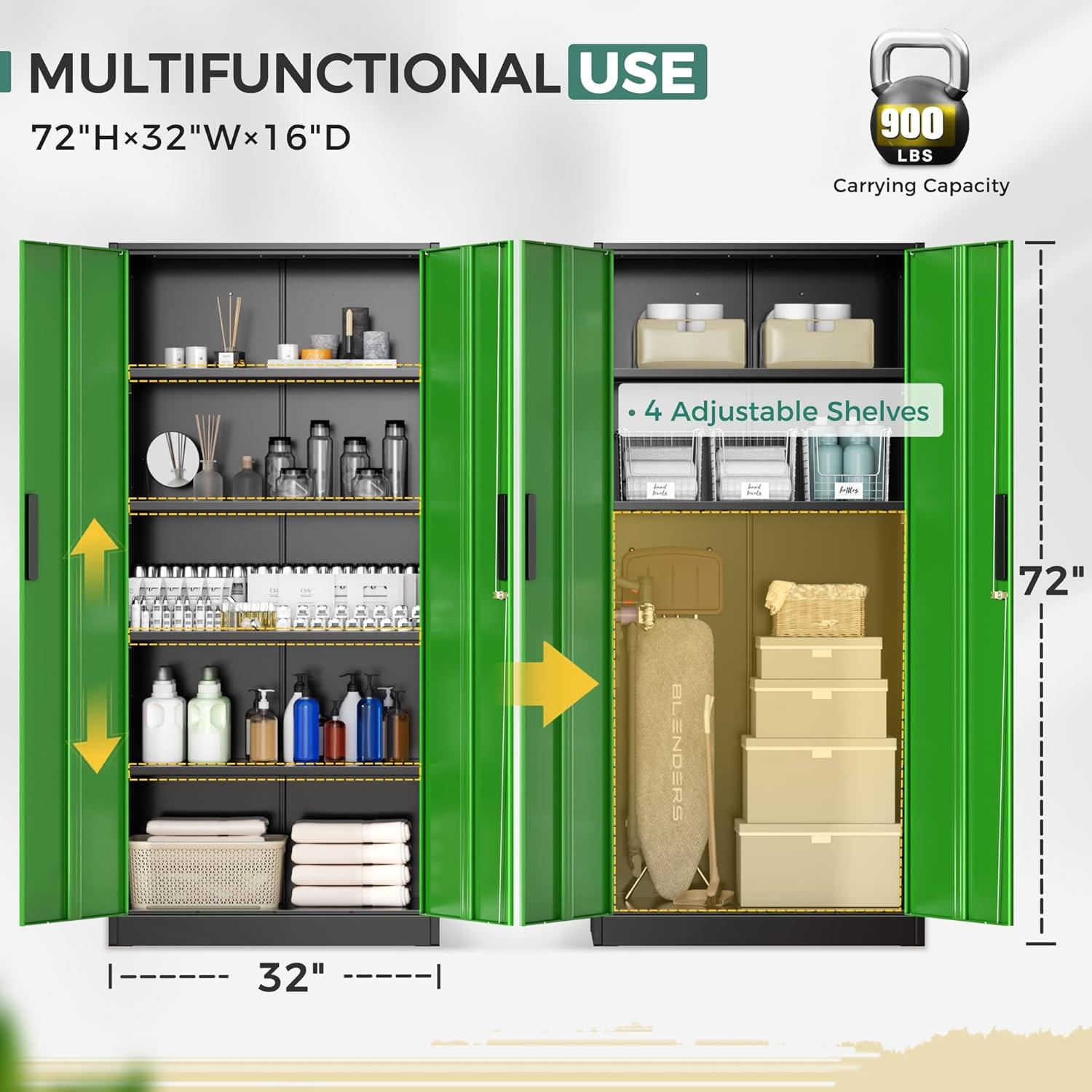 [Excellent Material&Durability]:Greenvelly metal locking cabinet with doors and shelves is made up of 0.88mm cold-rolled steel plate.The surface of metal garage storage cabinet is coated with anti-corrosion and anti-rust coating,which makes it more durable and suitable for indoor and outdoor scenes,such as office,garage,home,school.