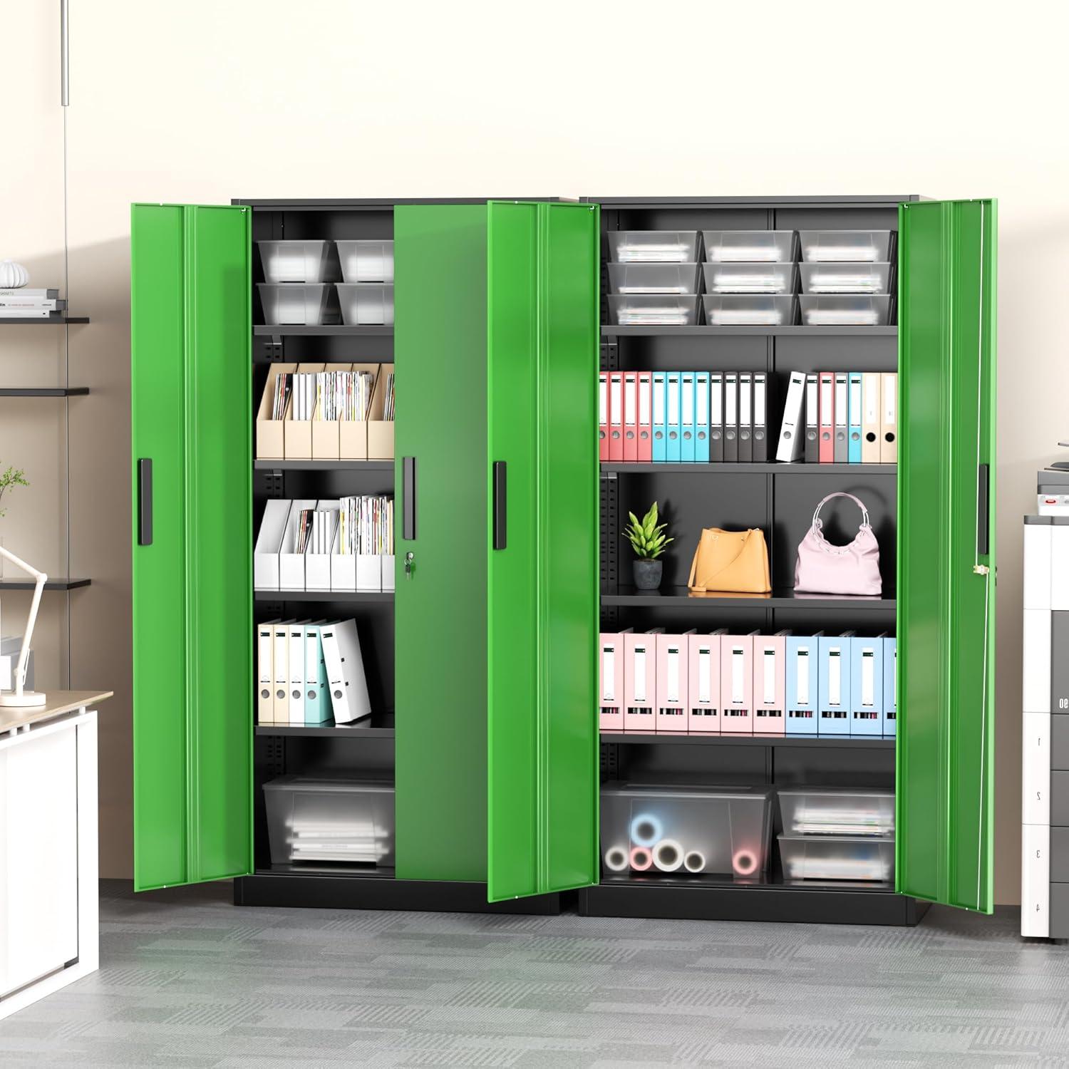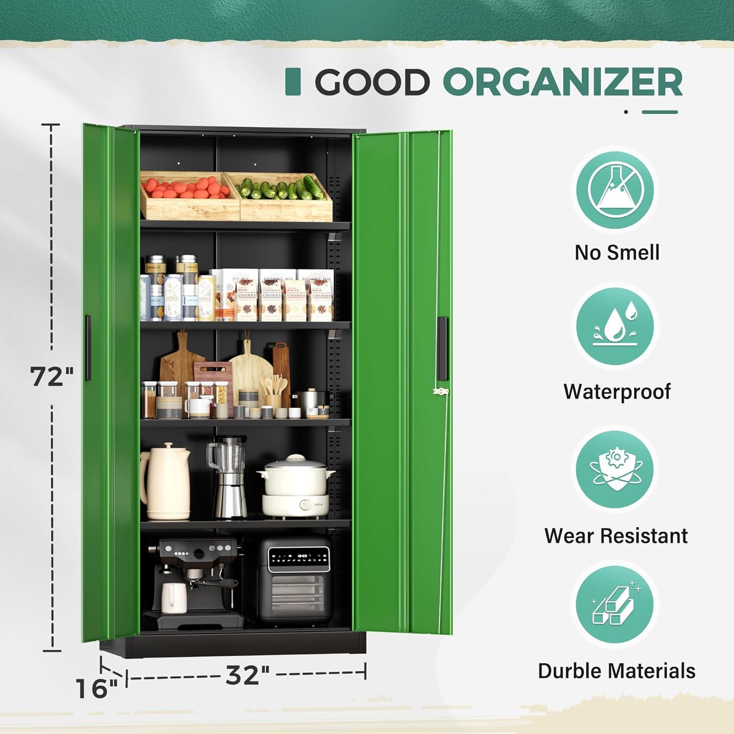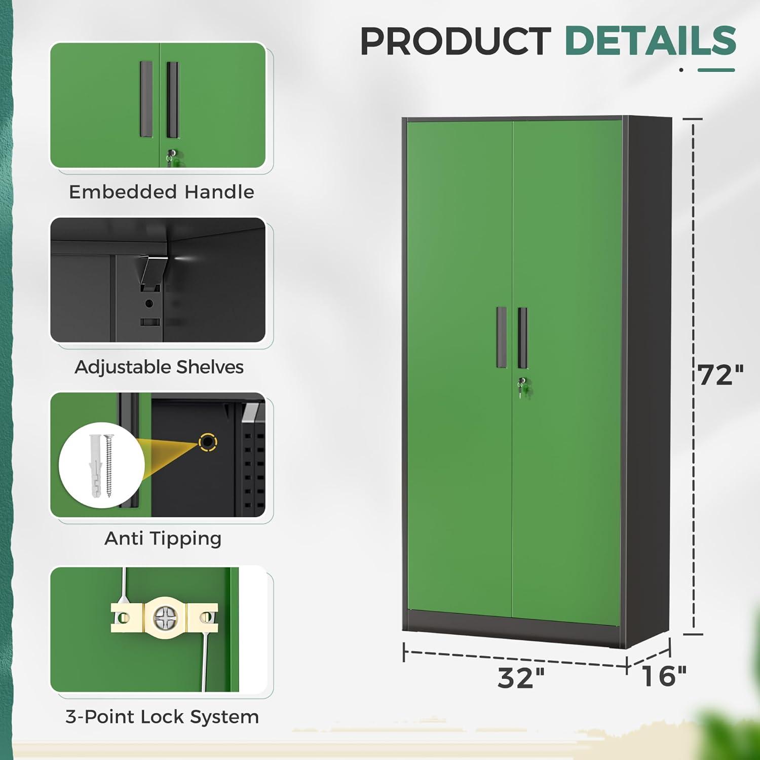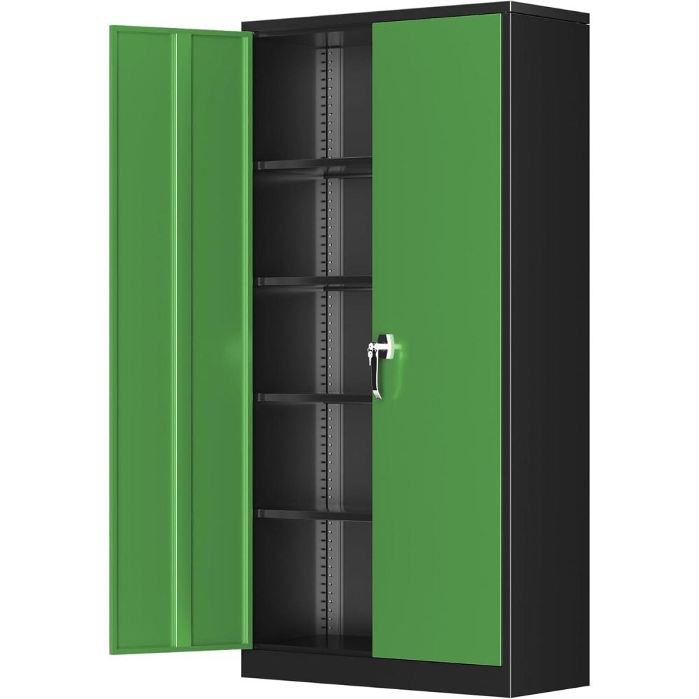 [Excellent Material&Durability]:Greenvelly metal locking cabinet with doors and shelves is made up of 0.88mm cold-rolled steel plate.The surface of metal garage storage cabinet is coated with anti-corrosion and anti-rust coating,which makes it more durable and suitable for indoor and outdoor scenes,such as office,garage,home,school.