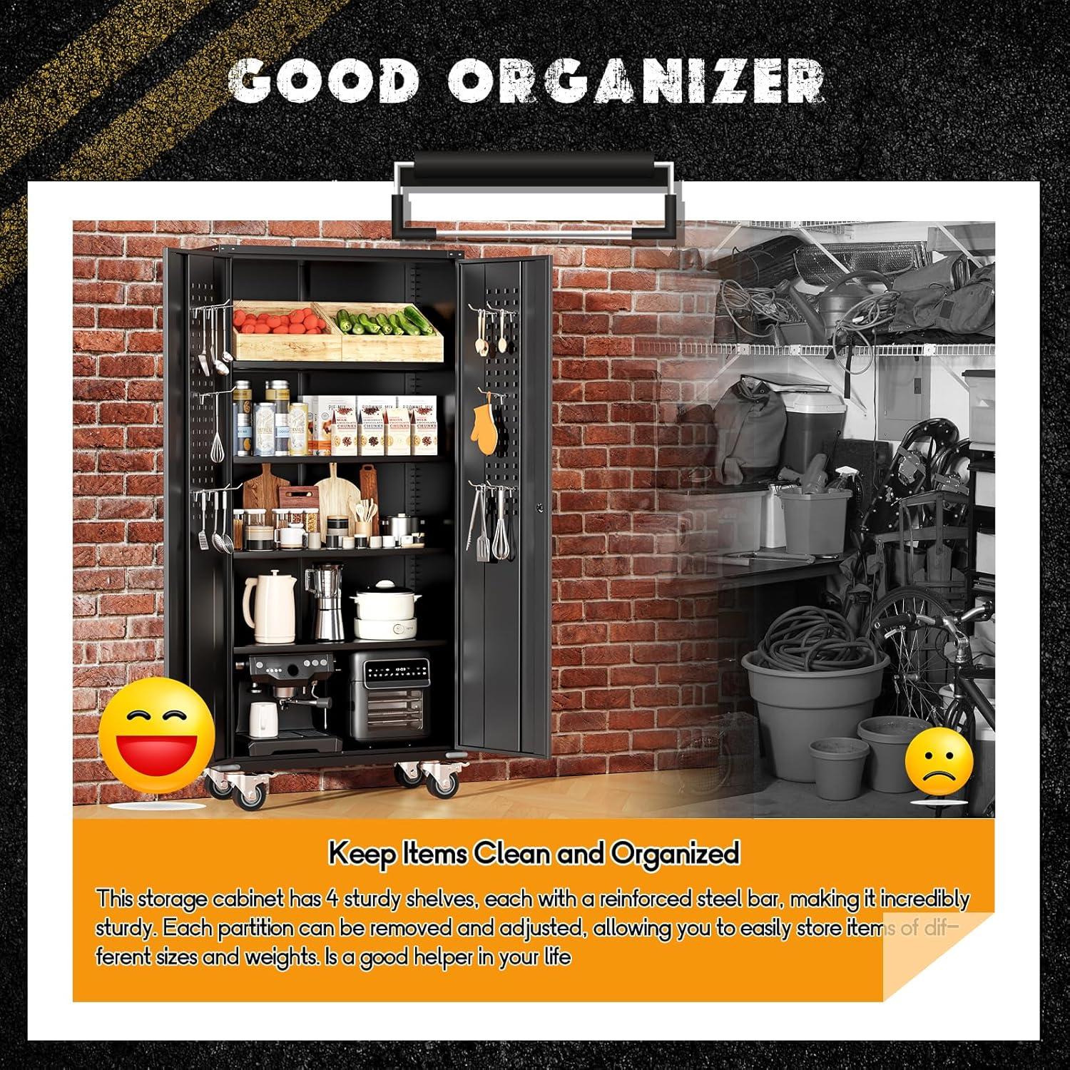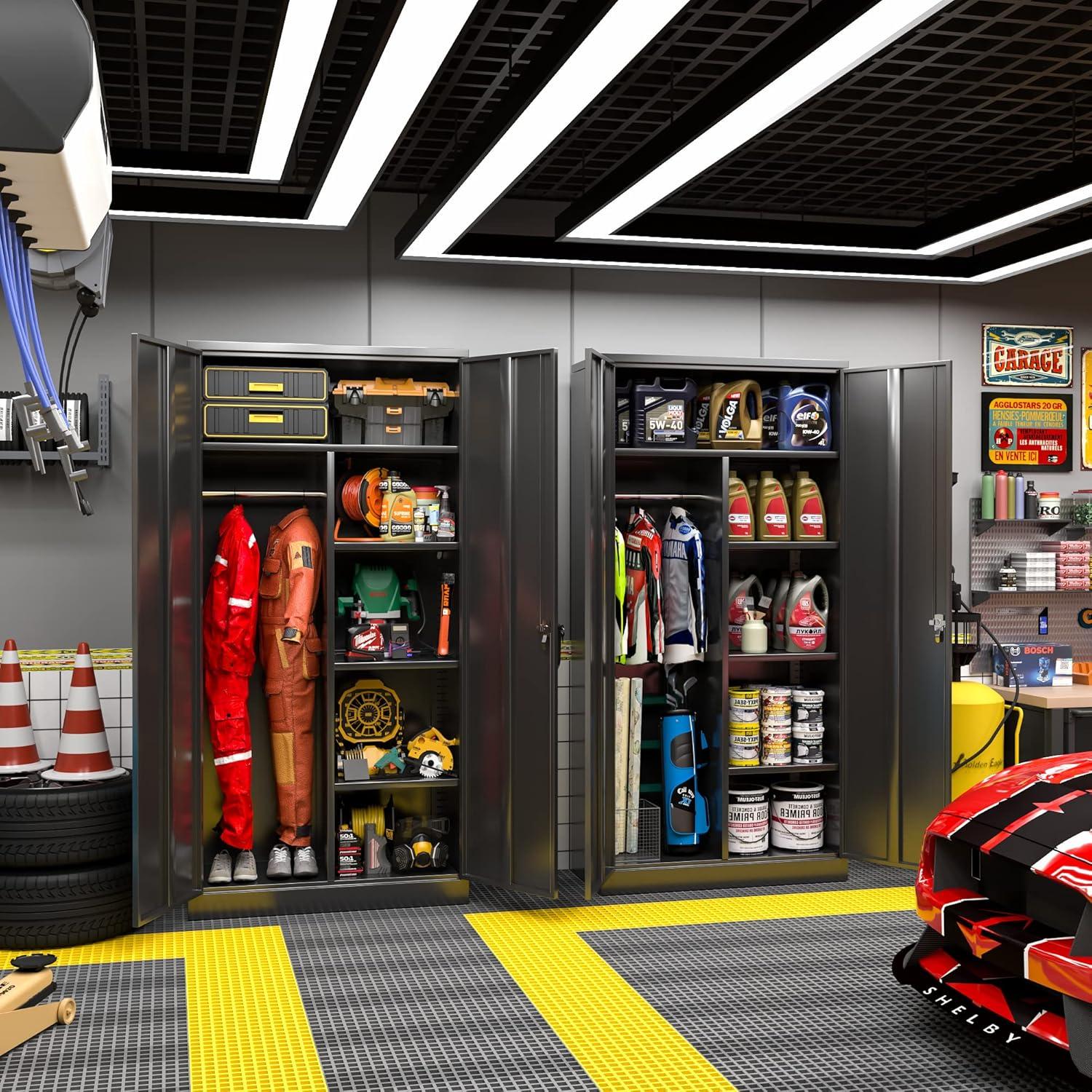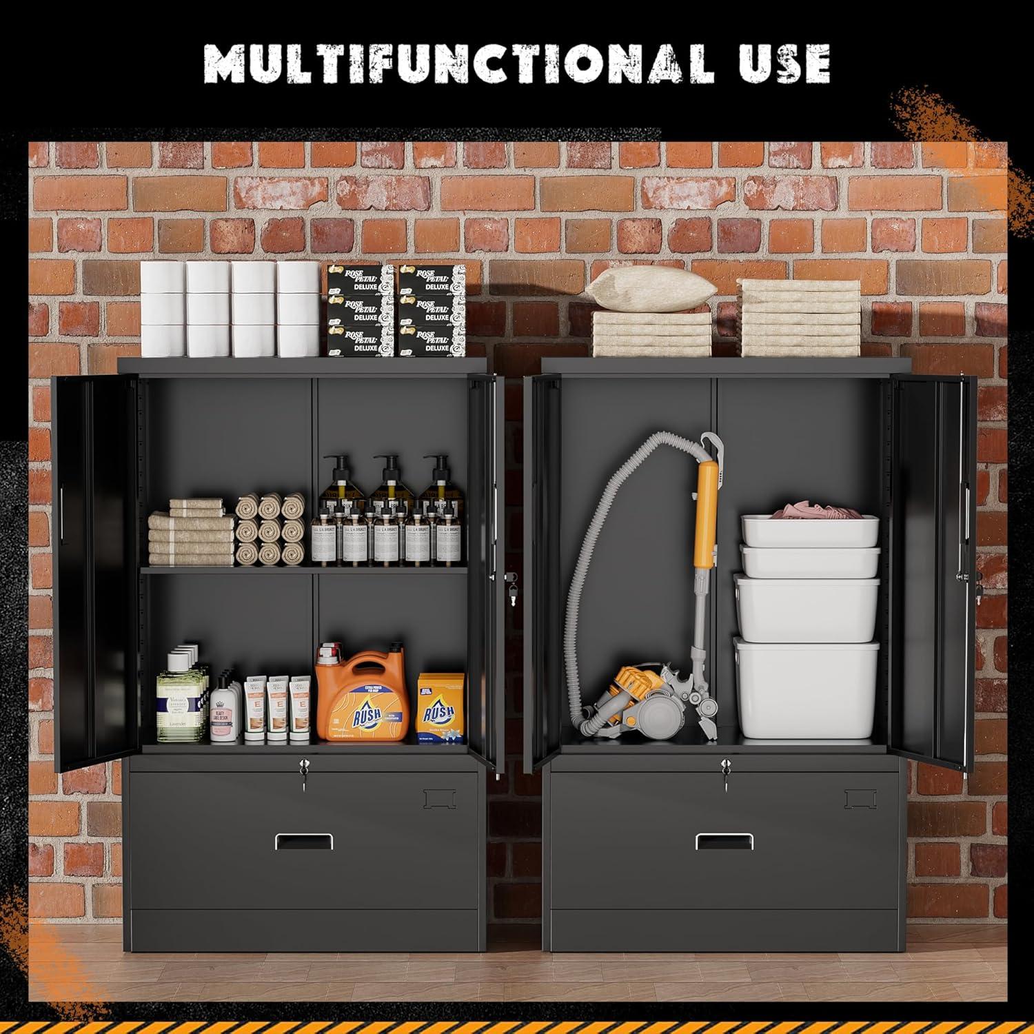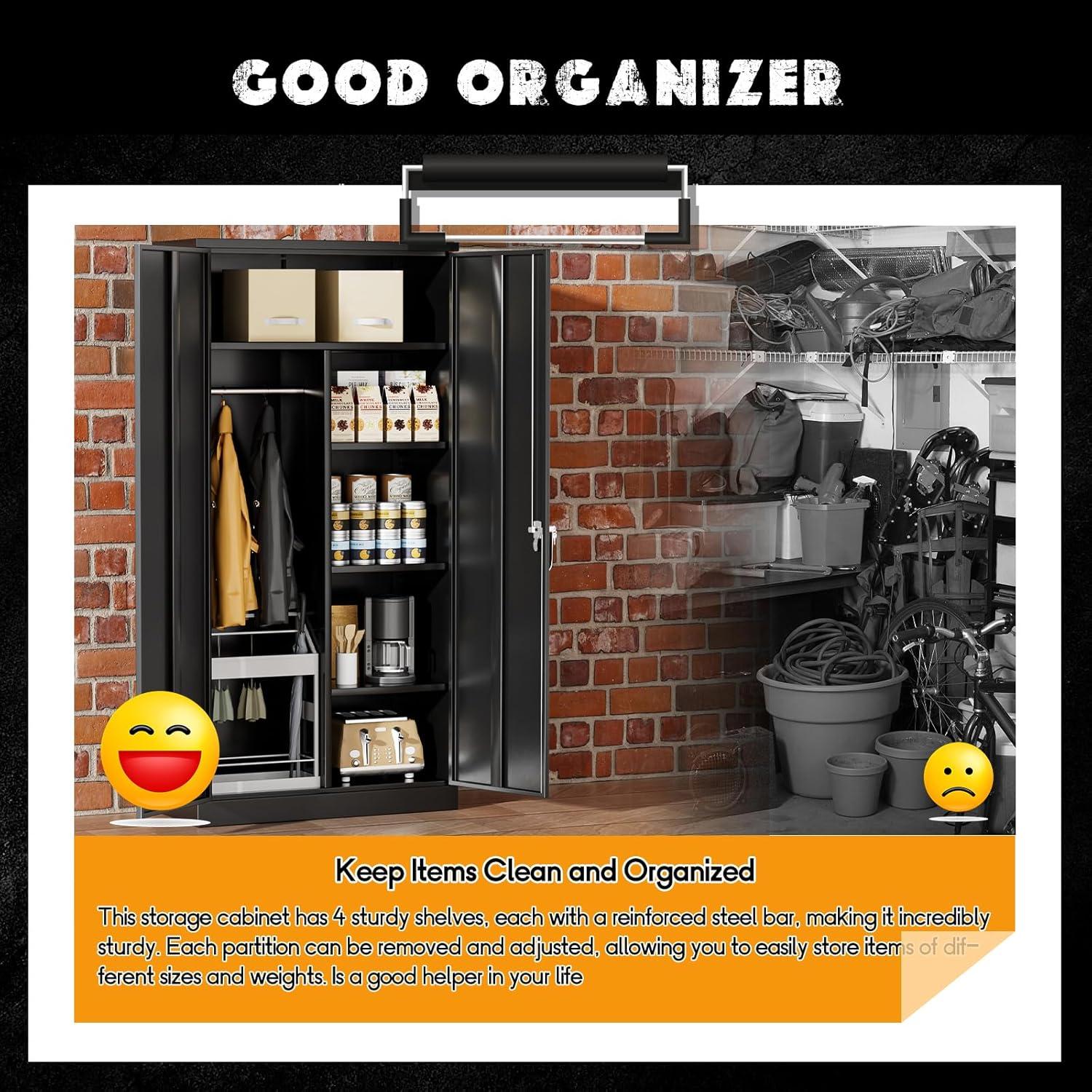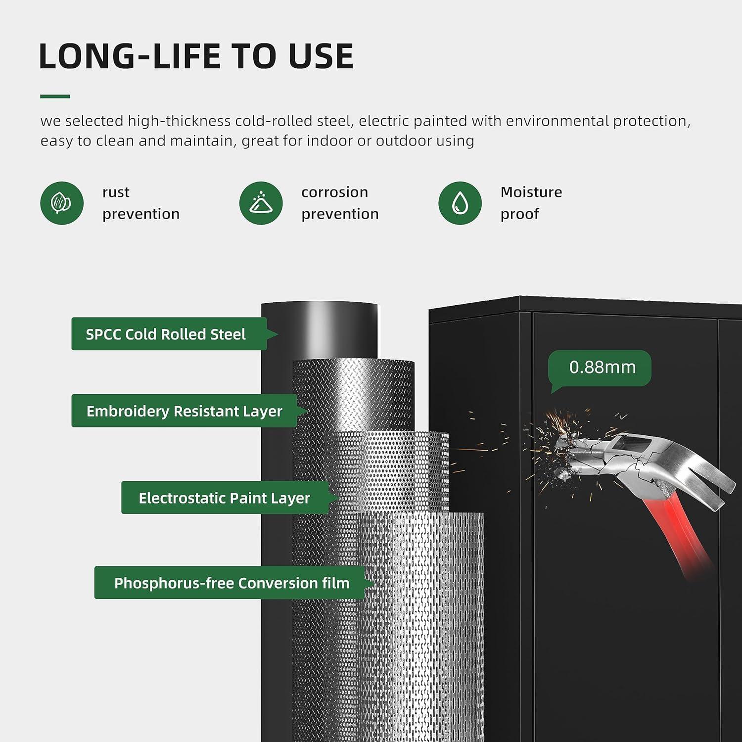 [Excellent Material&Durability]:Greenvelly metal locking cabinet with doors and shelves is made up of 0.88mm cold-rolled steel plate.The surface of metal garage storage cabinet is coated with anti-corrosion and anti-rust coating,which makes it more durable and suitable for indoor and outdoor scenes,such as office,garage,home,school.
