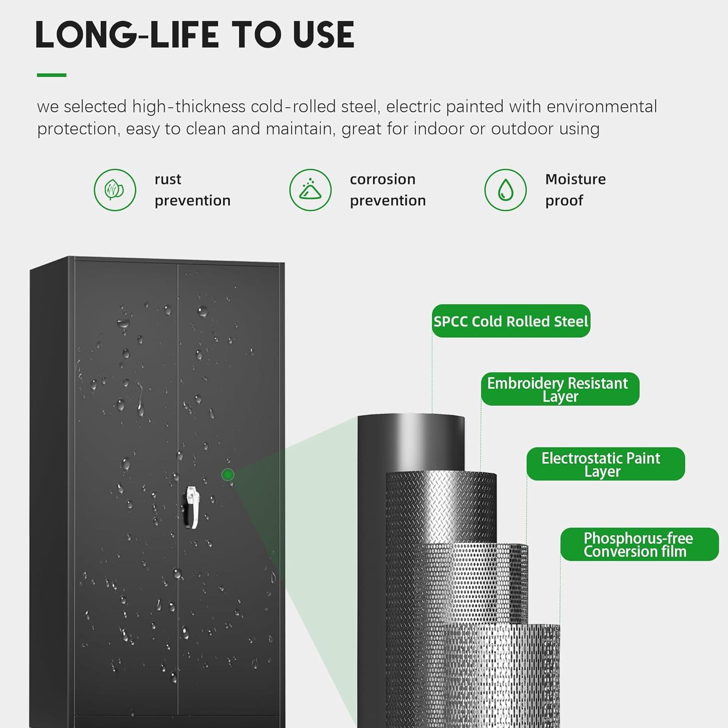 【Durable Metal Material】Greenvelly metal cabinet is made of thickened cold-rolled steel plates, and each partition can support up to 120 pounds of weight, providing stable support for your items. The surface of the metal cabinet is treated with powder coating technology, which is rust proof and wear-resistant, making it convenient for you to store items for a long time.