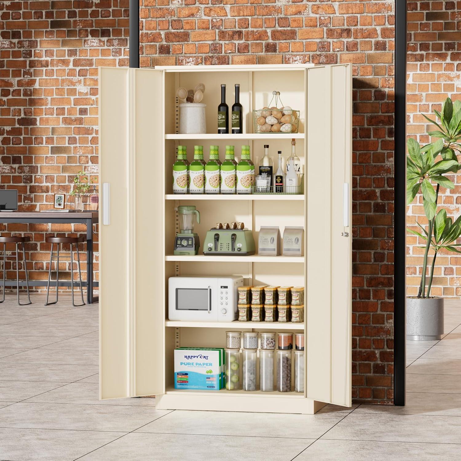 【5-layer Storage Space】Greenvelly metal storage cabinet with doors and 4 adjustable shelves can create 5 independent and spacious compartments. You can freely adjust the height of the partitions according to the size of your items, making it convenient for you to organize kitchen seasonings, household appliances, toiletries, office stationery, etc. in an orderly manner, helping you efficiently manage your items and easily access them.