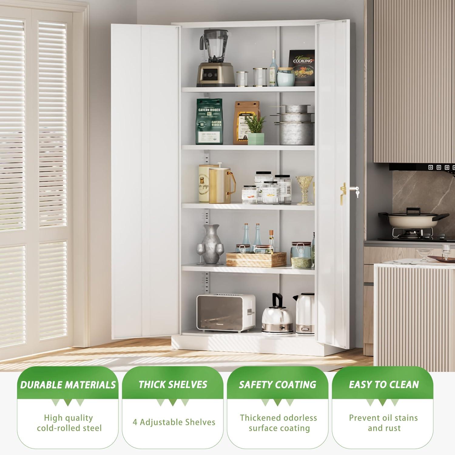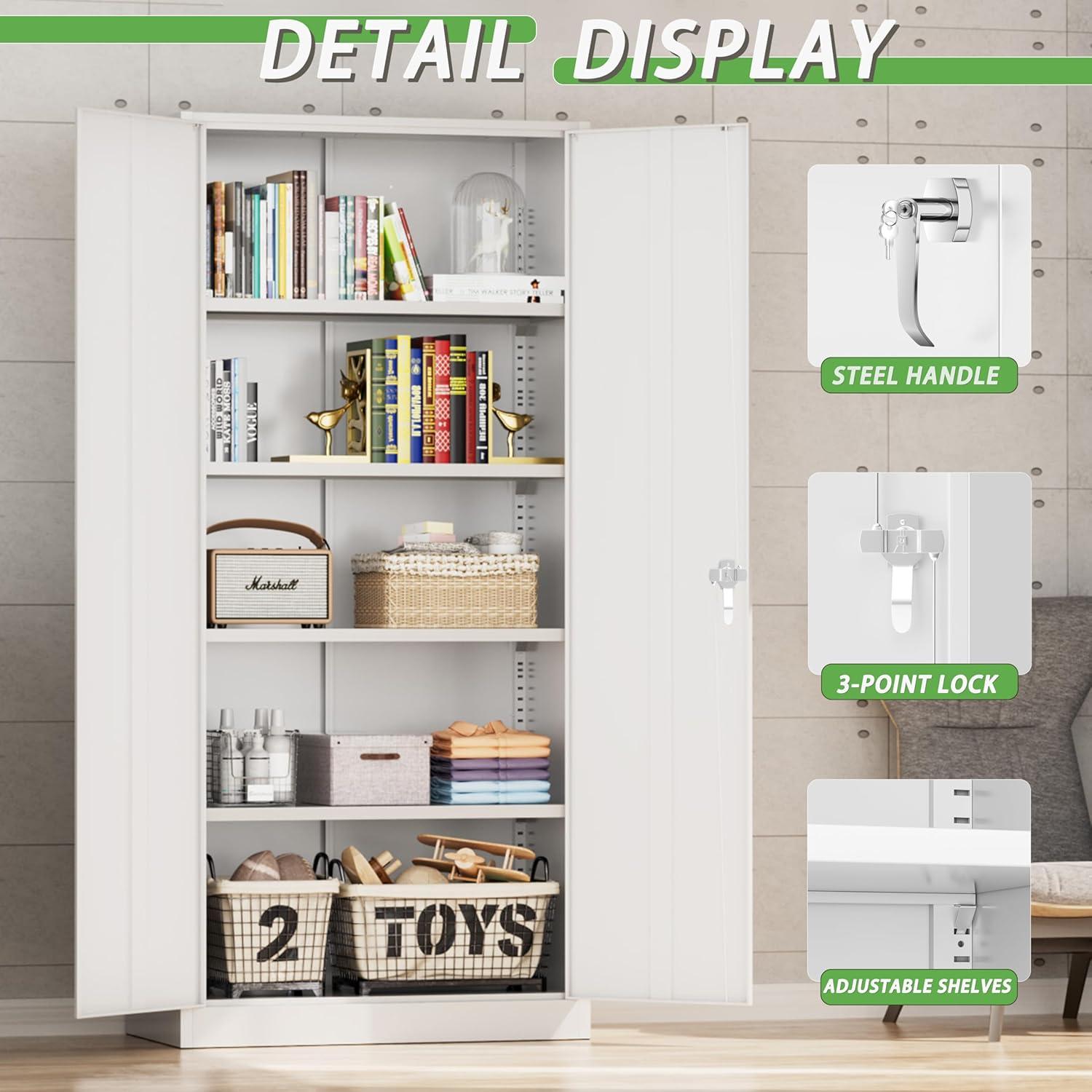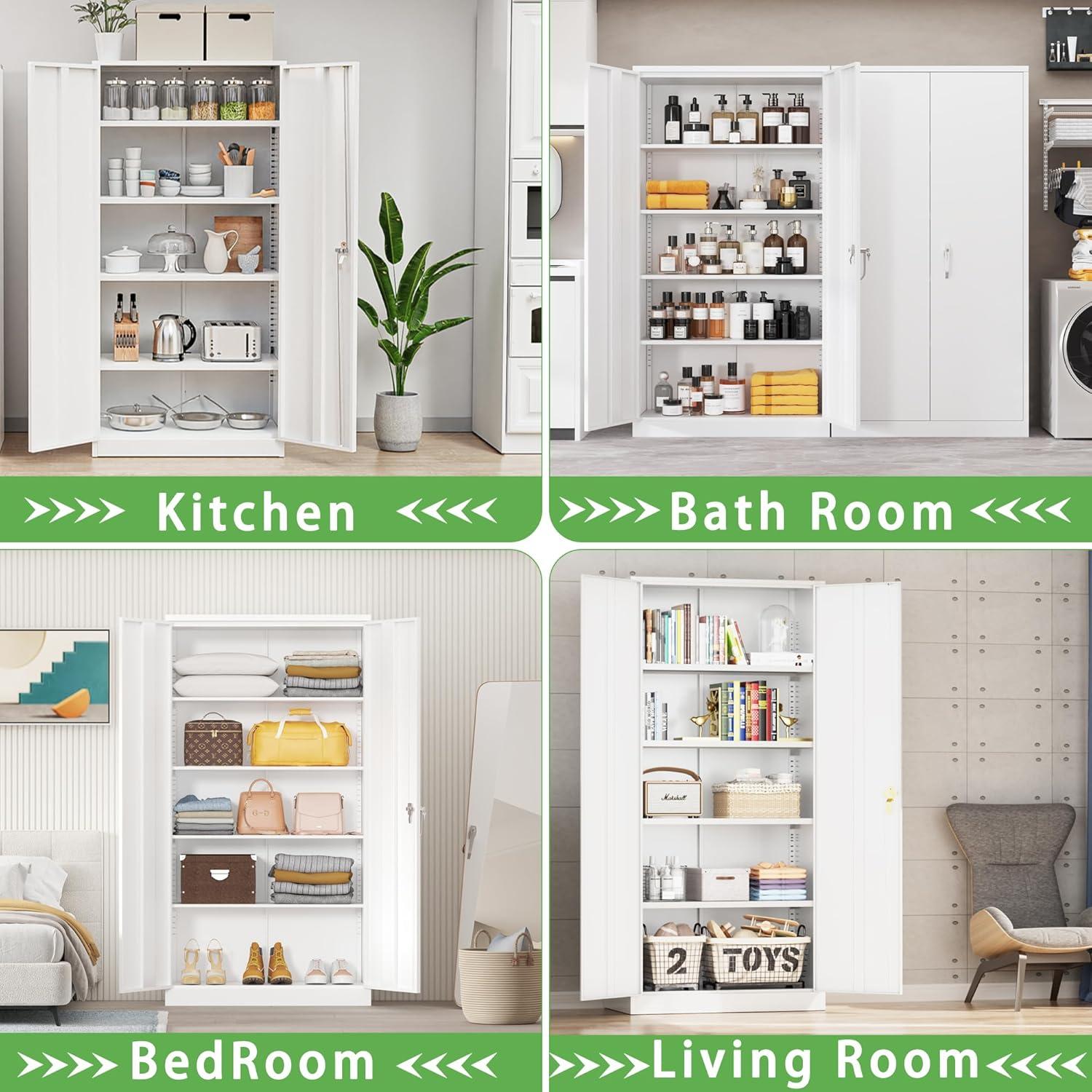 【5-layer Storage Space】Greenvelly metal storage cabinet with doors and 4 adjustable shelves can create 5 independent and spacious compartments. You can freely adjust the height of the partitions according to the size of your items, making it convenient for you to organize kitchen seasonings, household appliances, toiletries, office stationery, etc. in an orderly manner, helping you efficiently manage your items and easily access them.