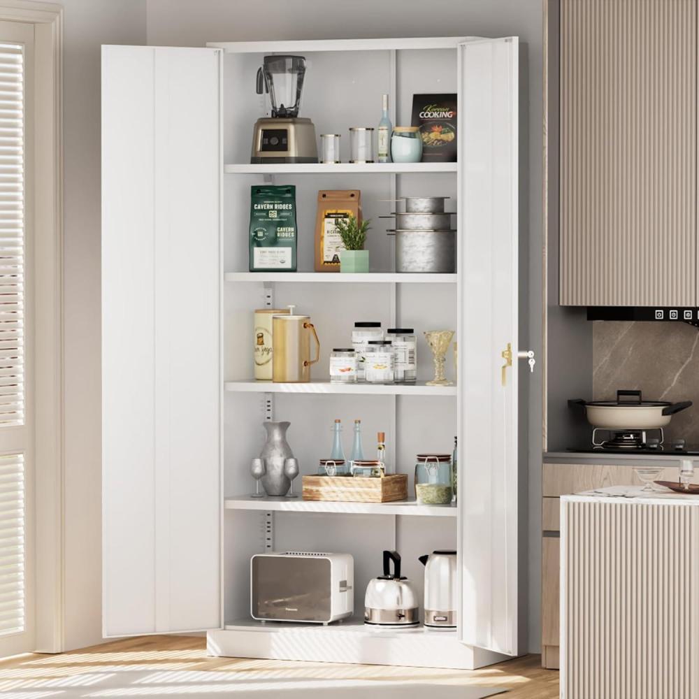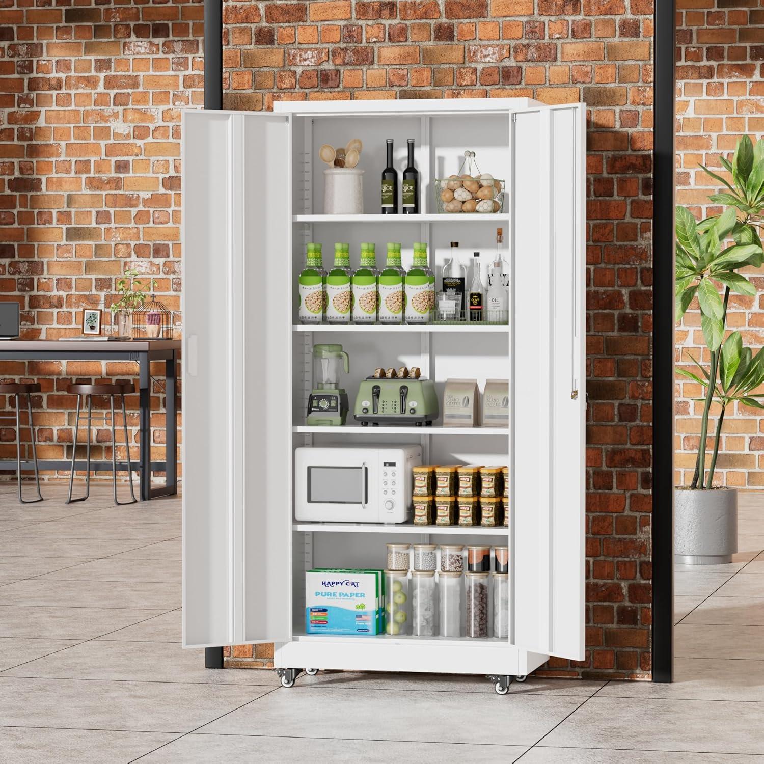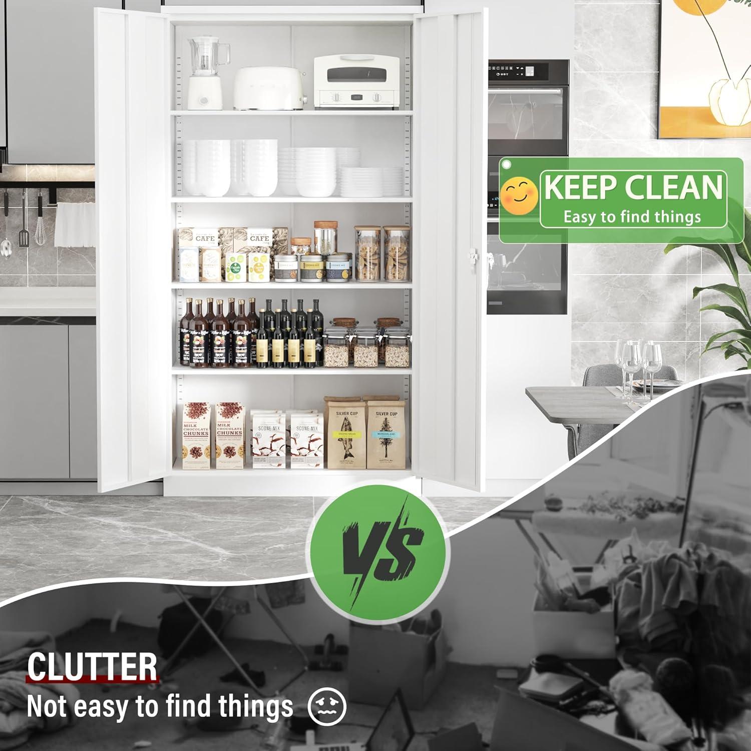 【5-layer Storage Space】Greenvelly metal storage cabinet with doors and 4 adjustable shelves can create 5 independent and spacious compartments. You can freely adjust the height of the partitions according to the size of your items, making it convenient for you to organize kitchen seasonings, household appliances, toiletries, office stationery, etc. in an orderly manner, helping you efficiently manage your items and easily access them.