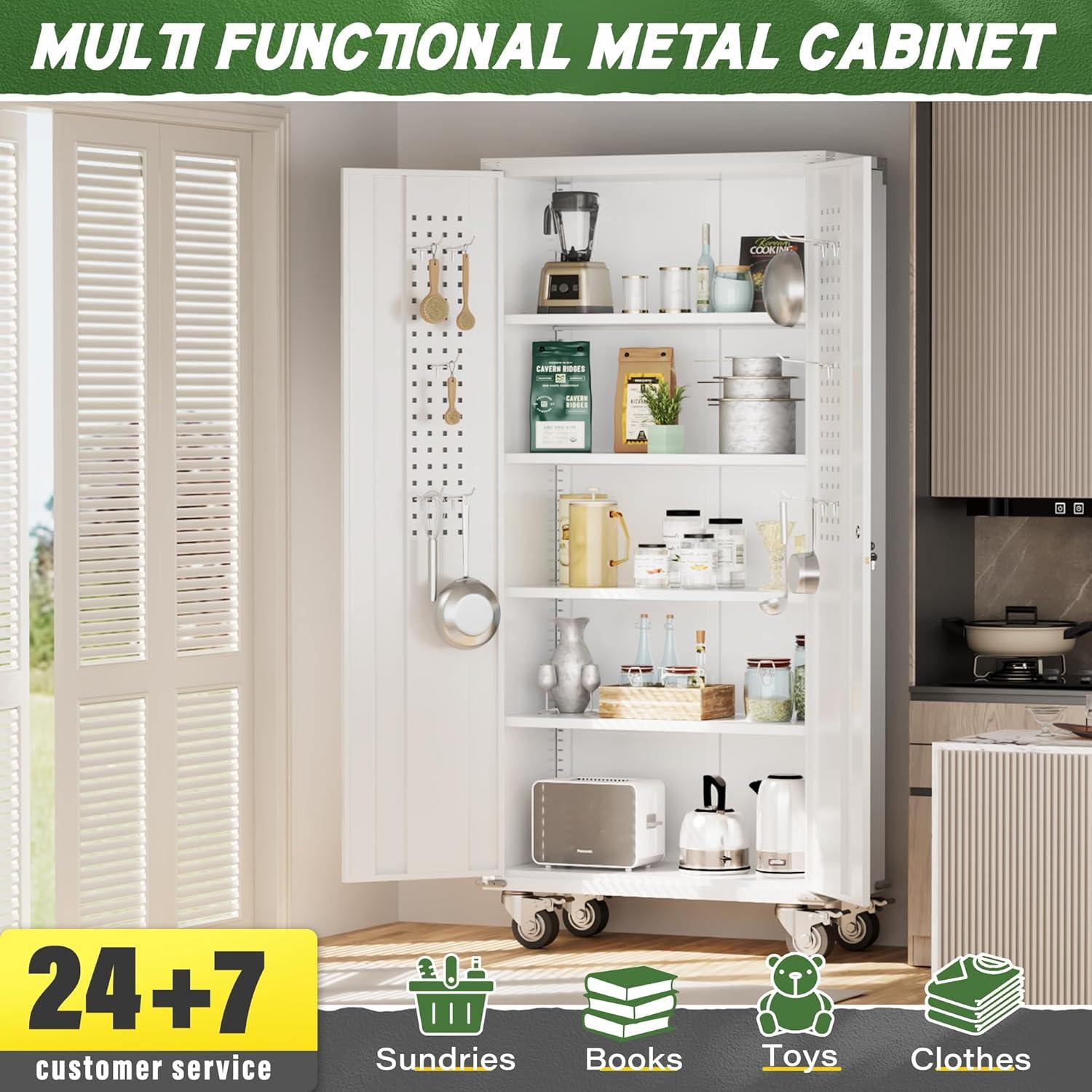 Greenvelly Metal Storage Cabinet with 4 Swivel Wheels,73" H White Garage Storage Cabinet with Wheels, Rolling Tool Cabinet with Locking Doors and Shelves for Home,Basement, Kitchen Pantry,Warehouse(White)