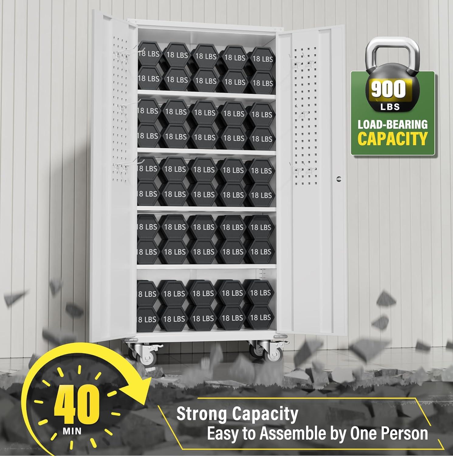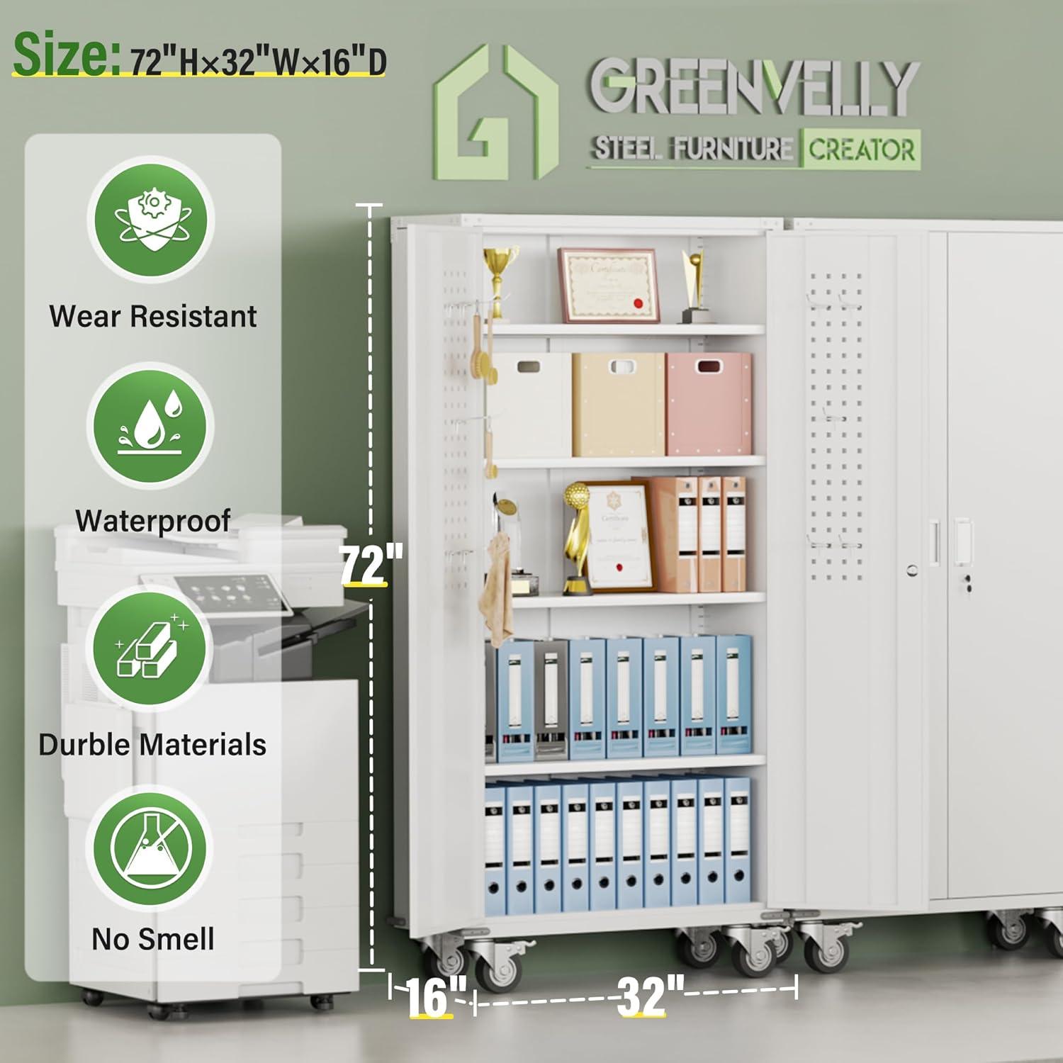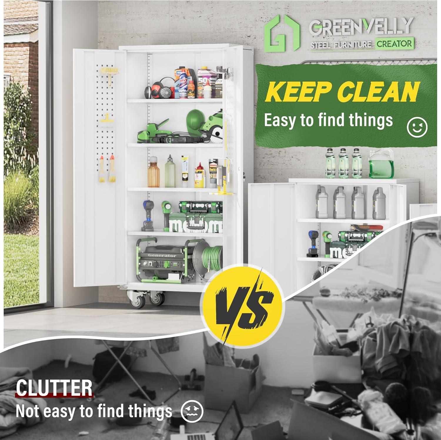 【High-Quality Material & Load-bearing Capacity】Greenvelly metal storage cabinet is made of durable cold-rolled steel,with each shelf capable of supporting up to 120 pounds,demonstrating excellent load-bearing capacity.Its surface is coated with a rust-resistant and wear-resistant finish,suitable for various work locations,whether wet or dry.It is ideal for garages,kitchen and storage rooms.