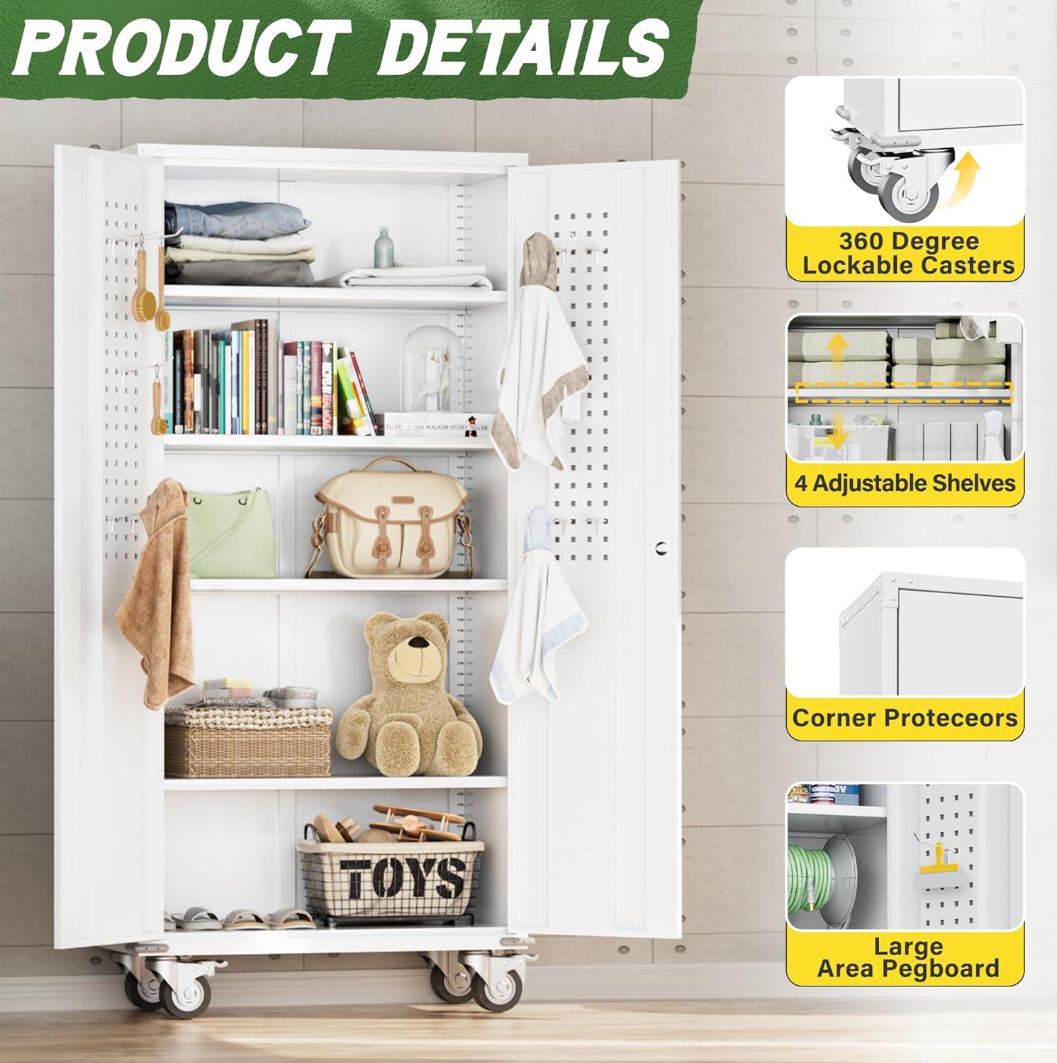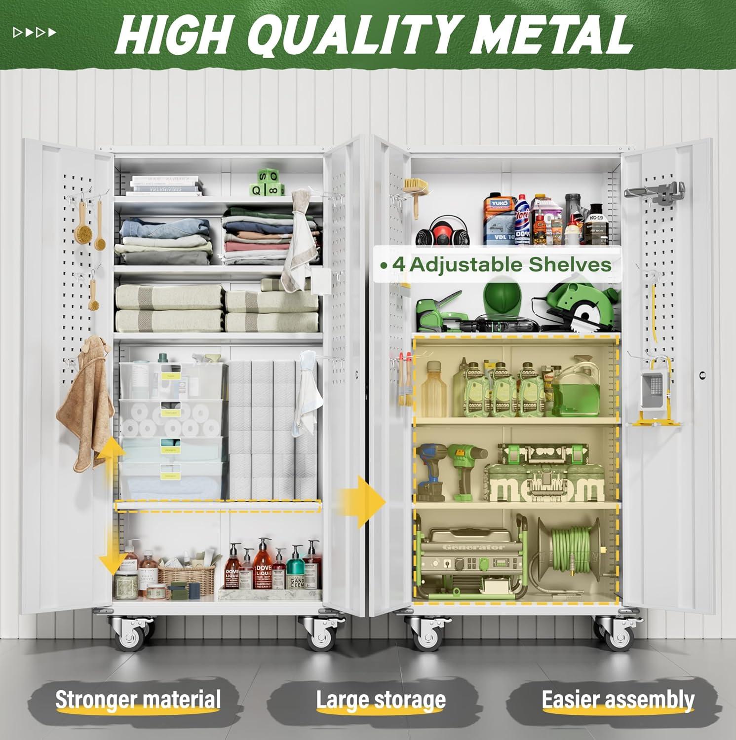【Adjustable metal shelves】 The garage storage cabinet is equipped with 4 metal shelves, and you can freely adjust the position of the shelves. This design can accommodate items of different heights for storage. Therefore, this storage cabinet with wheels is an excellent choice for efficient storage of kitchen utensils, garage tools, and documents.