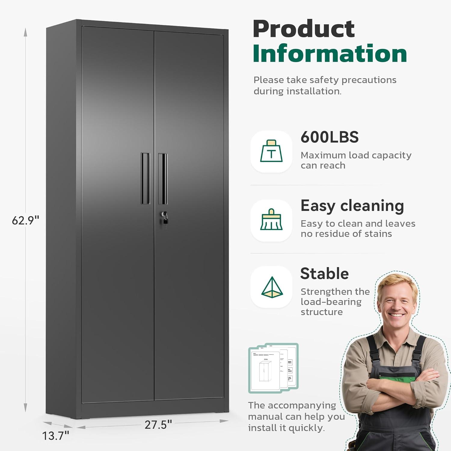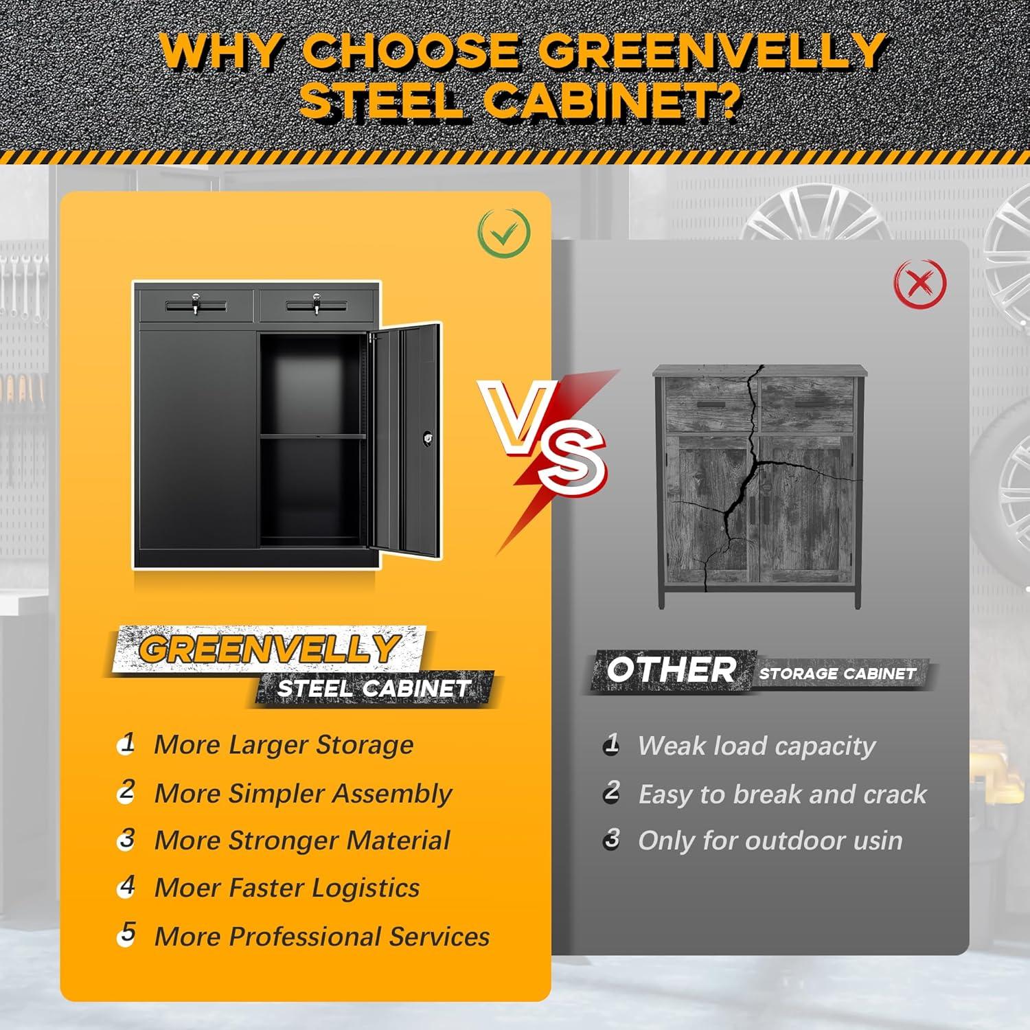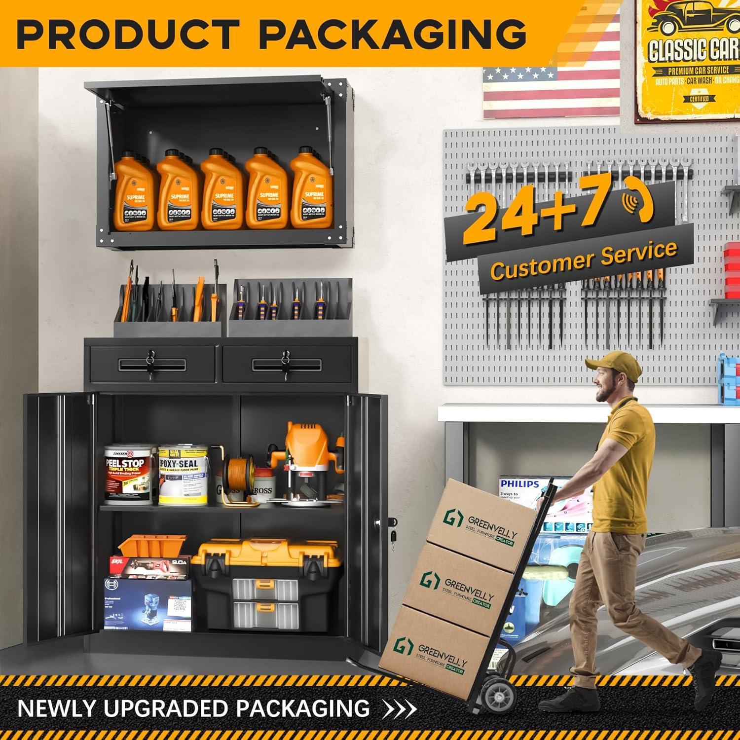 [Assembly and After-sales]:Greenvelly locking storage cabinet is designed to be disassembled, with a comprehensive assembly guide and installation video included in the packaging,making it easy to set up even for those without experience.The garage storage cabinet is securely packed with foam boards during shipping to ensure its safety. Should you encounter any issues or require assistance after your purchase,our customer service team is always ready to assist you.