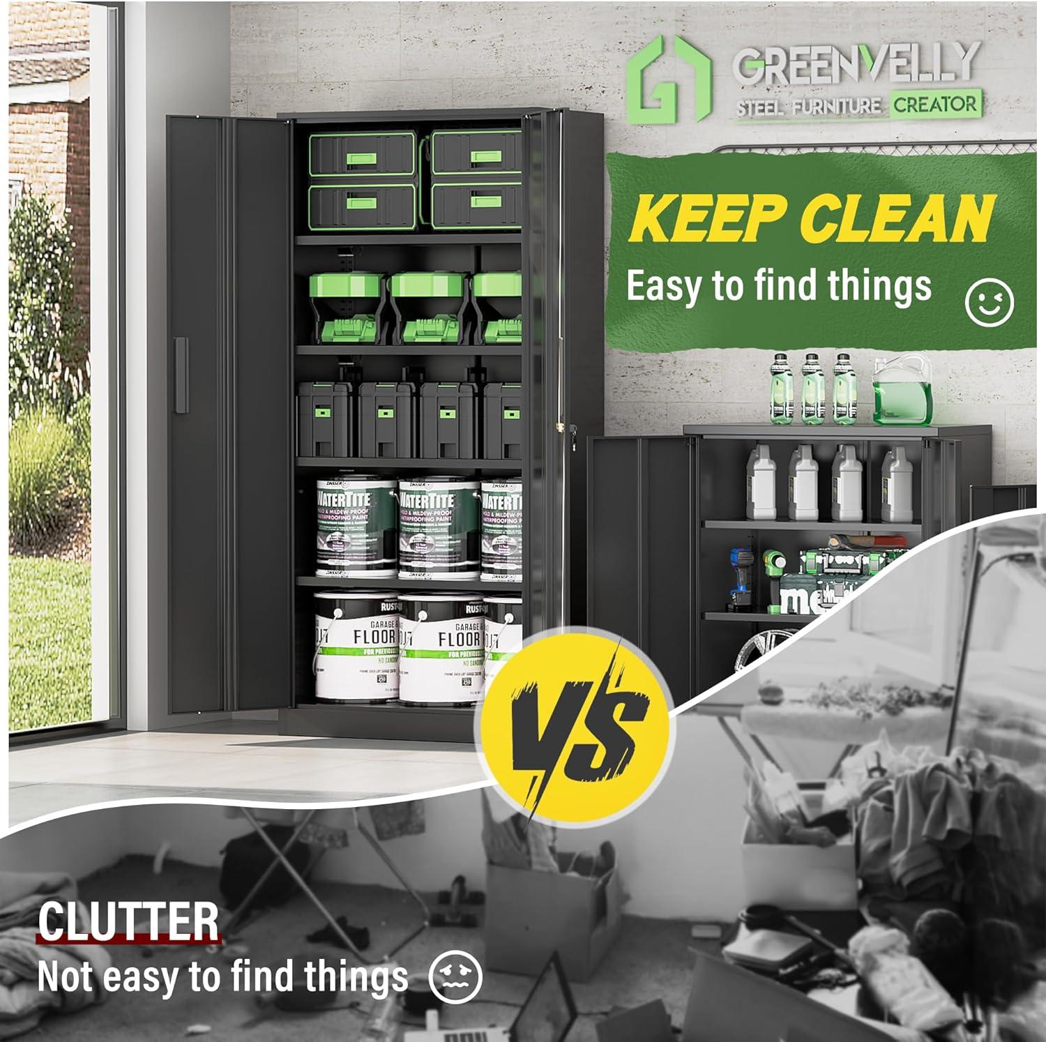 [High-quality Materials]:Greenvelly storage cabinet for garage is made of premium steel with a thickness of 8mm,offering a robust structure with excellent load-bearing capabilities.It has a surface treatment of phosphorus-free powder coating,which is scratch-resistant and anti-rust,making it easy to dry and clean.It is perfectly suited for placement in various environments such as kitchens,bedrooms,schools or garages.