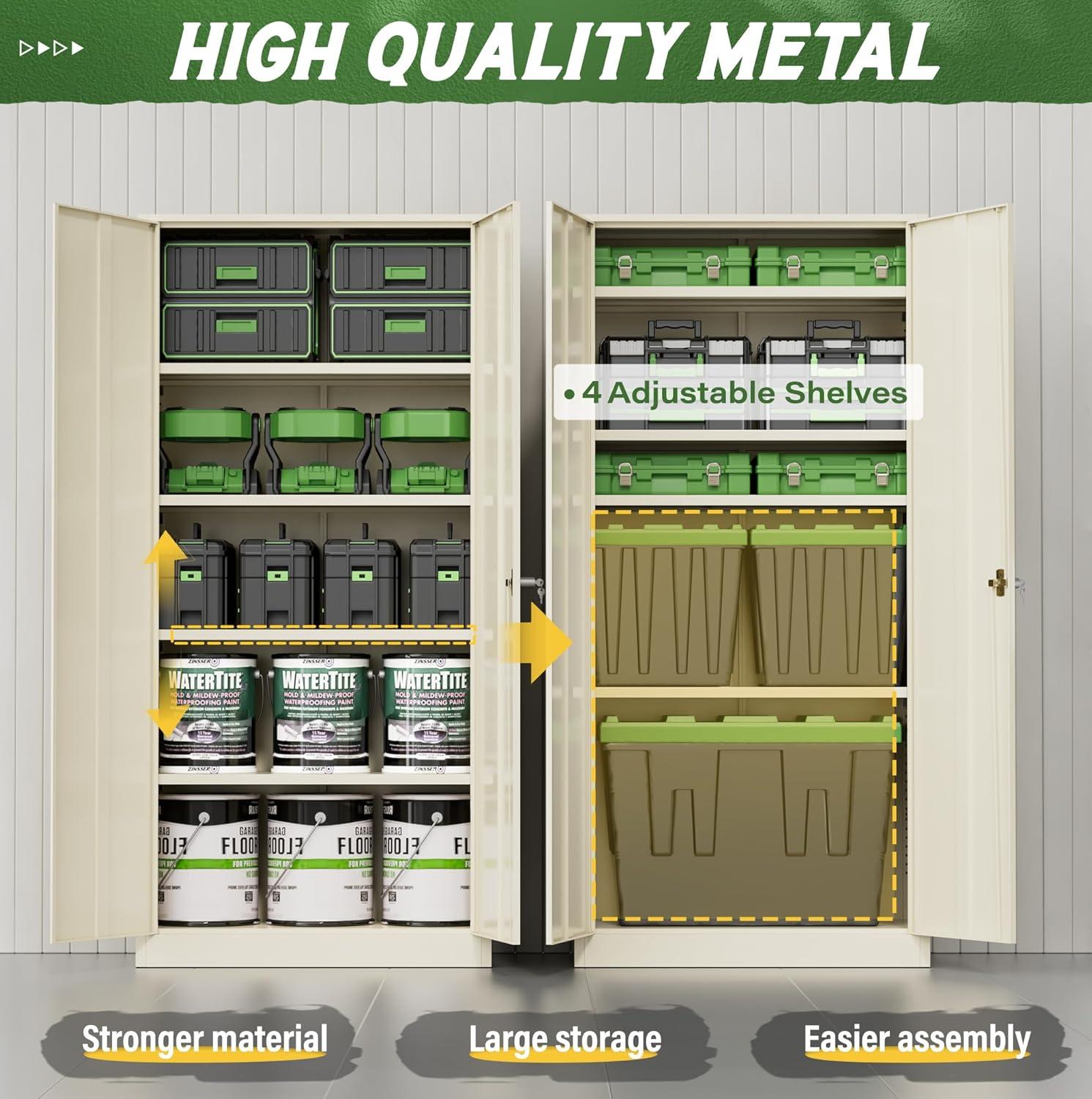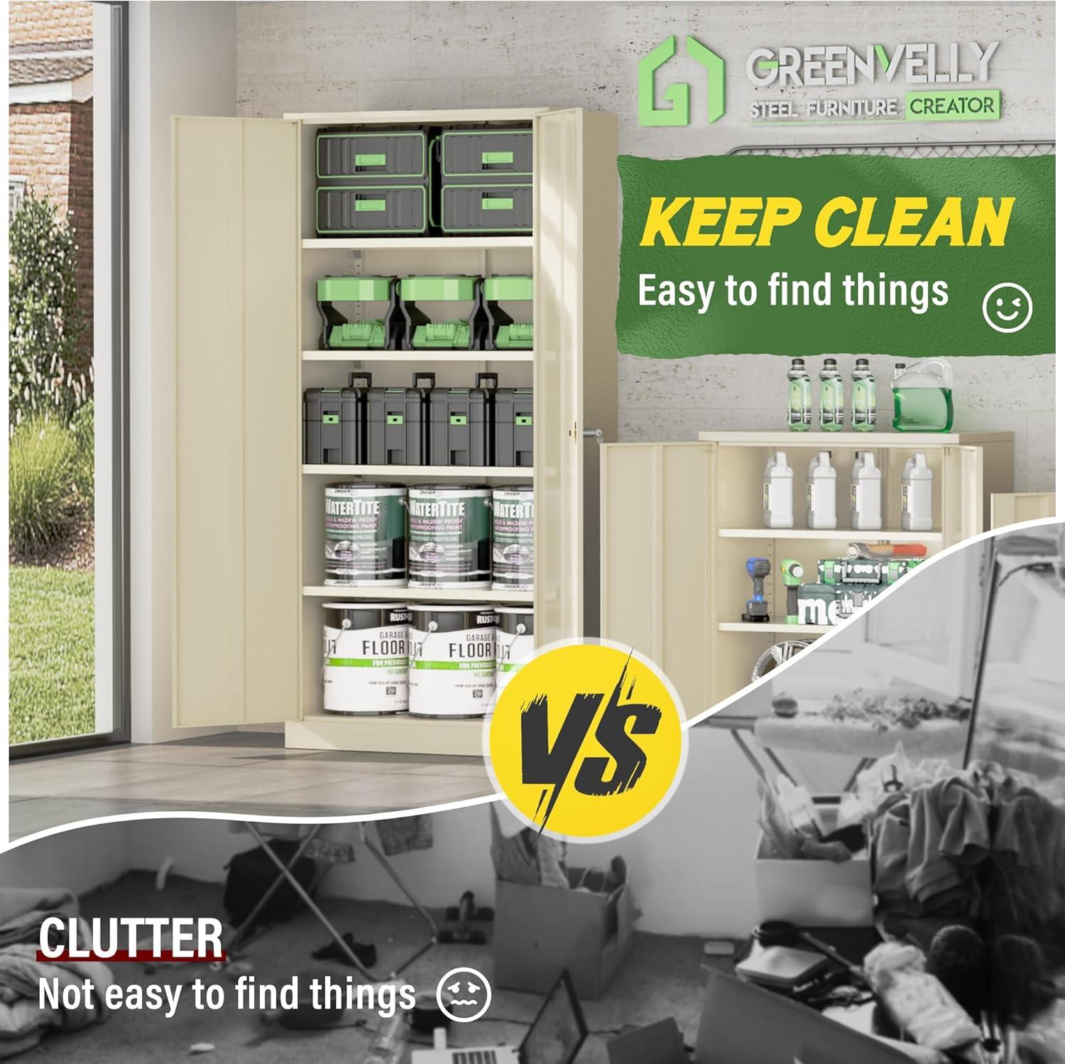 [High-quality Materials]:Greenvelly storage cabinet for garage is made of premium steel with a thickness of 8mm,offering a robust structure with excellent load-bearing capabilities.It has a surface treatment of phosphorus-free powder coating,which is scratch-resistant and anti-rust,making it easy to dry and clean.It is perfectly suited for placement in various environments such as kitchens,bedrooms,schools or garages.