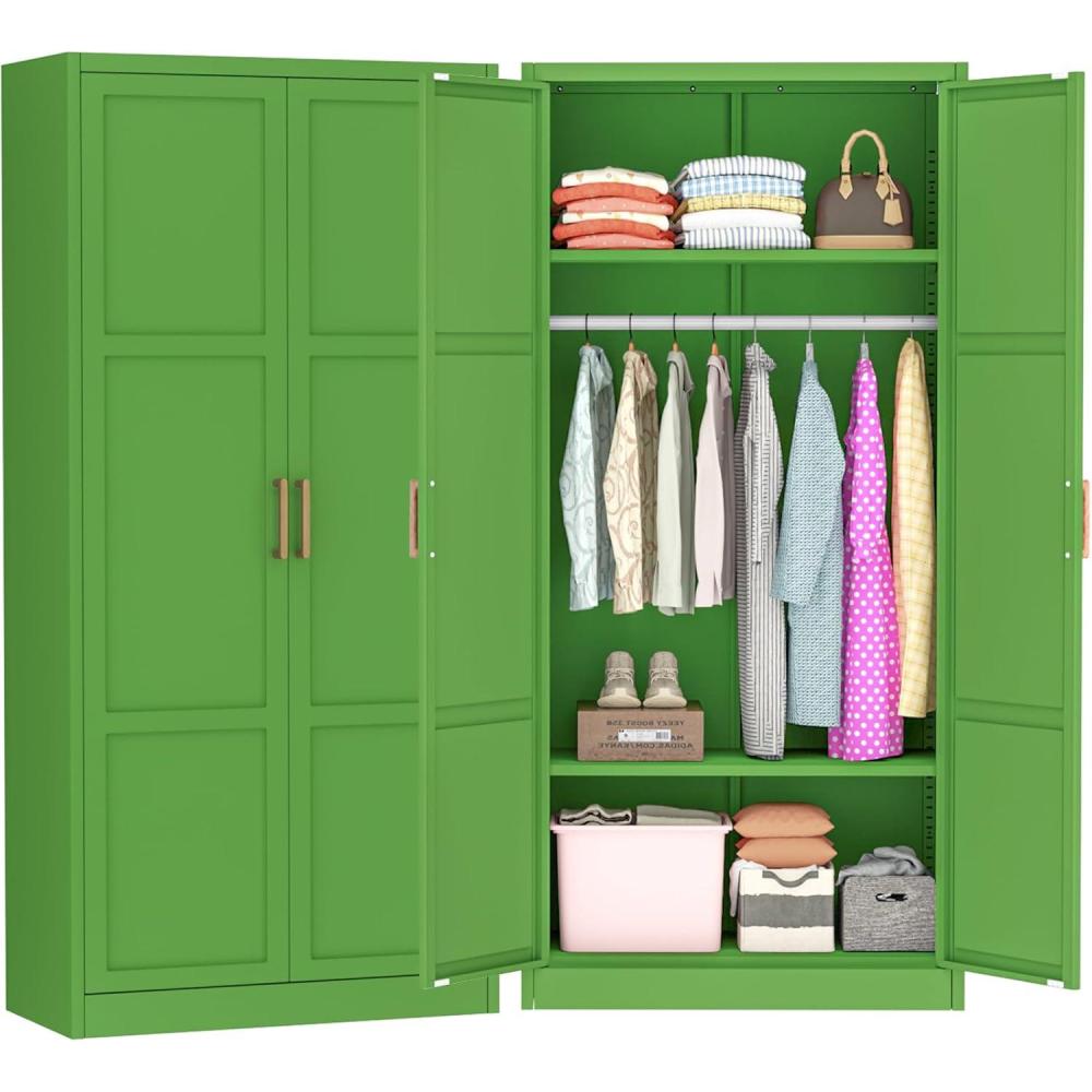 Greenvelly Metal Wardrobe Cabinet with Wooden Handle, 72" Metal Wardrobe Closet with Hanging Rods and Adjustable Shelves, Clothing Storage Closet Cabinet for Home, Office, Employee, Gym (White)(Green)
