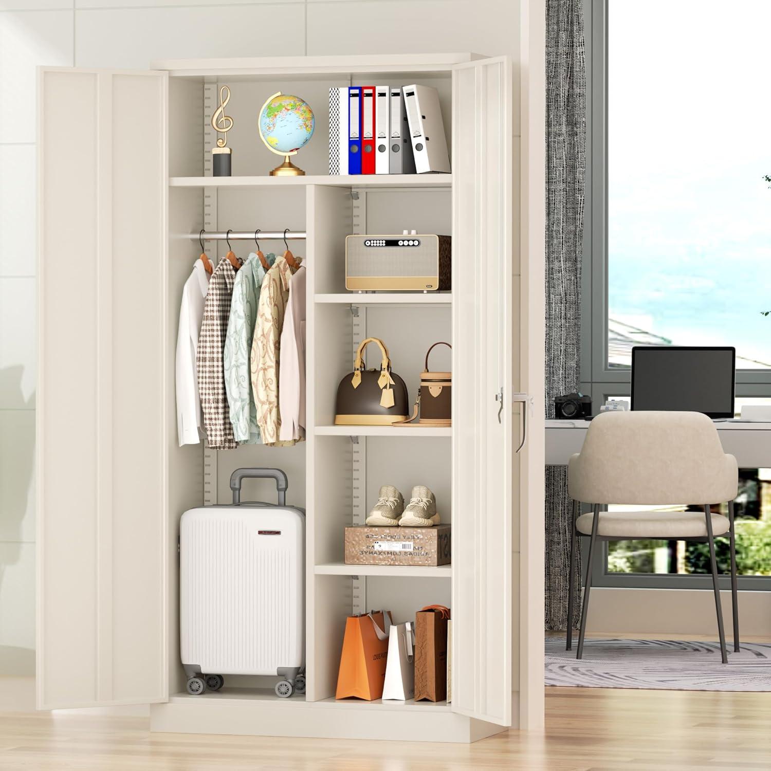 Greenvelly Metal Wardrobe Cabinet with Wooden Handle, 72″ Metal Wardrobe Closet with Hanging Rods and Adjustable Shelves, Clothing Storage Closet Cabinet for Home, Office, Employee, Gym (White)(White)