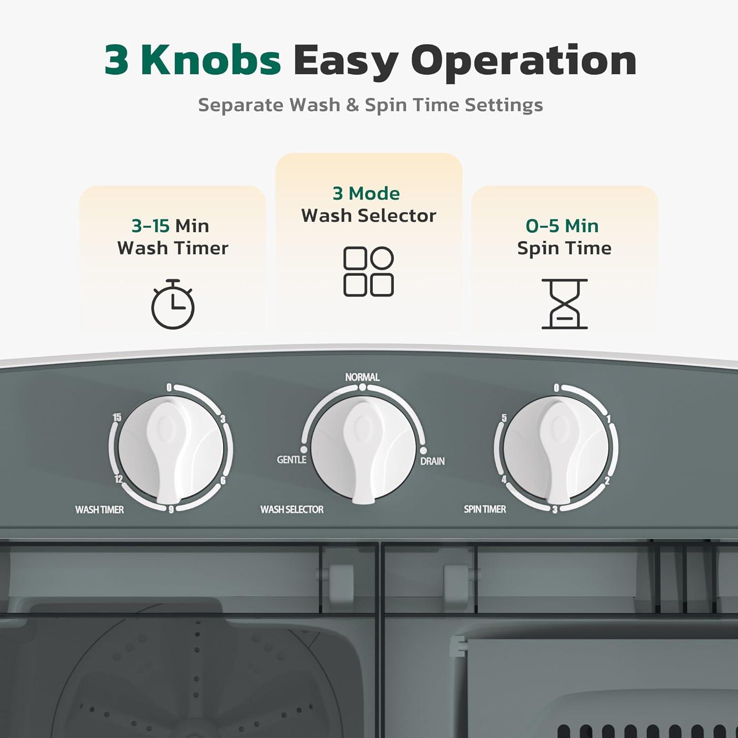 [Independent Time Control]: Greenvelly portable washer dryer combo combination has three independent controls: washing time (0-15 minutes), mode (mild/standard/drain), and dehydration time (0-5 minutes). You can set the time based on the number of clothes. We suggest soaking the clothes in advance for 0-20 minutes to make them cleaner to clean.