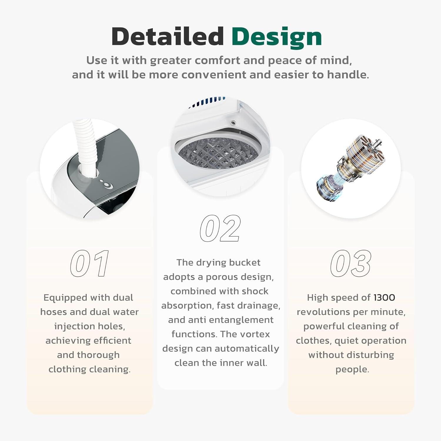 [ Powerful Performance]: This portable washing machine is equipped with a powerful copper core motor at 1300RPM and a washing power of 250W, which can effectively remove stains. With a dehydration power of 140W, it can achieve fast spin drying and say goodbye to prolonged drying.