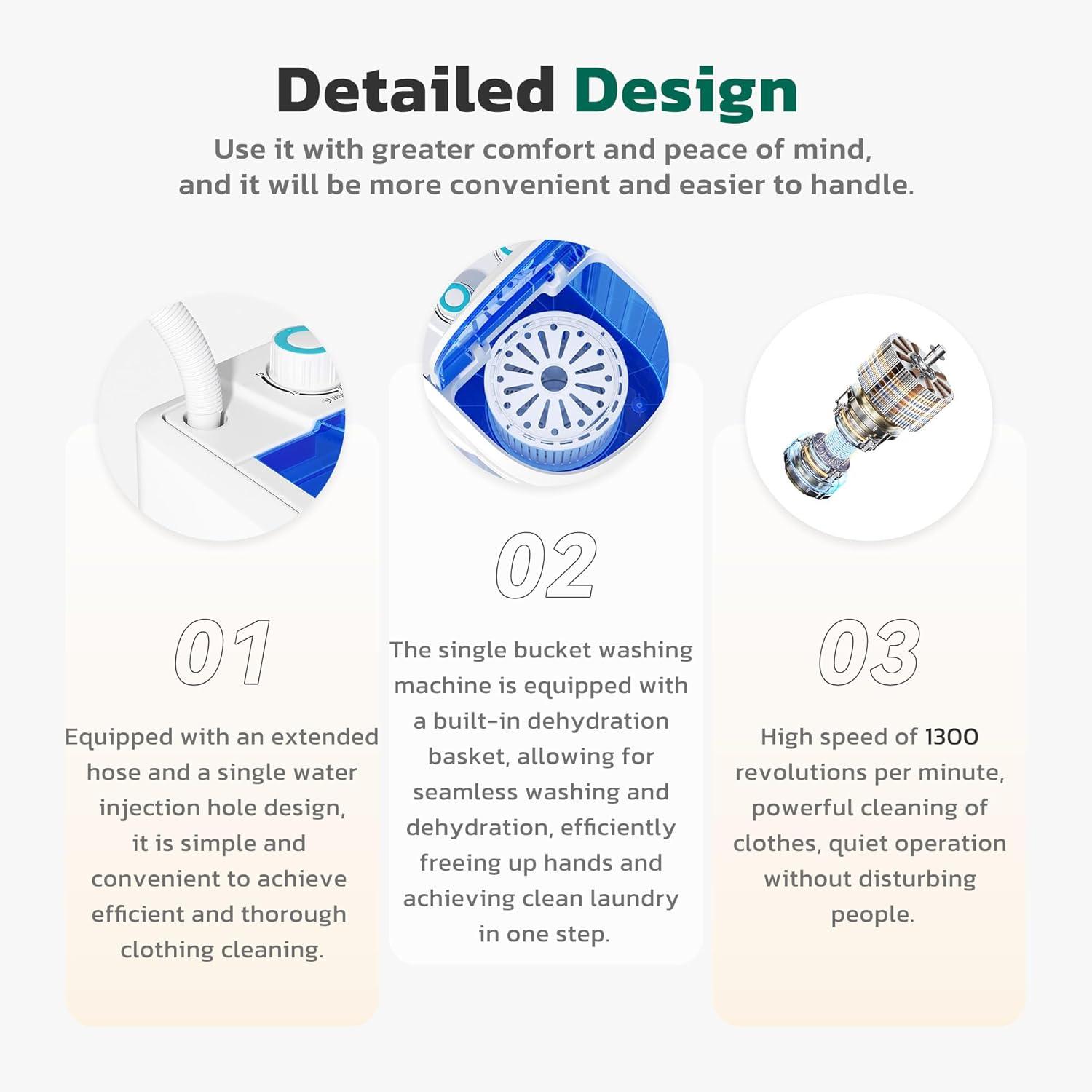 【Easy Control of Cleaning】The single bucket washing machine has a washing capacity of 5.5 pounds and a dehydration capacity of 1.1 pounds, meeting the daily laundry needs of families. A powerful motor with a speed of 1300 revolutions per minute is used for efficient swirling washing, powerful stain removal, and fast spin drying, effectively cleaning clothes.