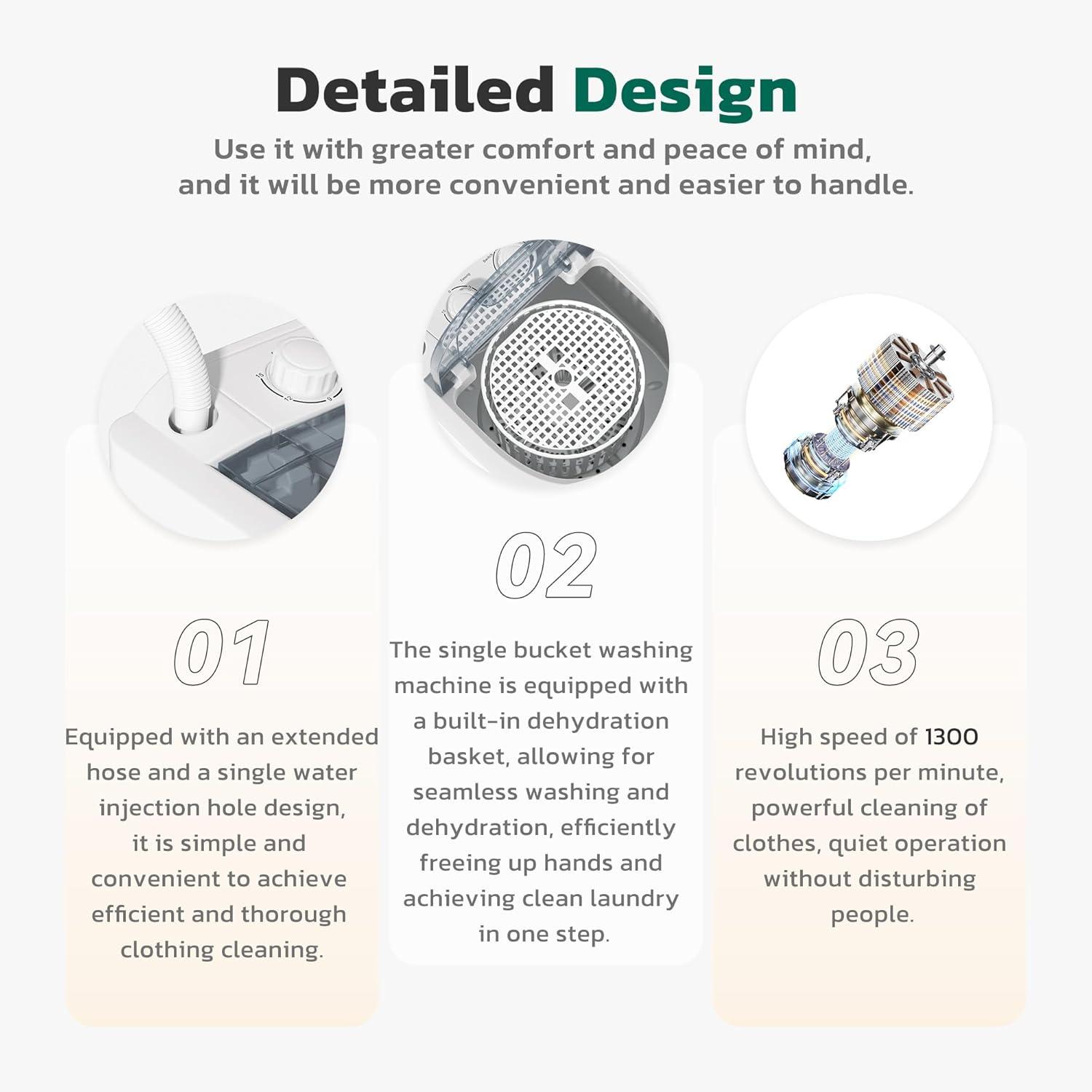 【Easy Control of Cleaning】The single bucket washing machine has a washing capacity of 5.5 pounds and a dehydration capacity of 1.1 pounds, meeting the daily laundry needs of families. A powerful motor with a speed of 1300 revolutions per minute is used for efficient swirling washing, powerful stain removal, and fast spin drying, effectively cleaning clothes.
