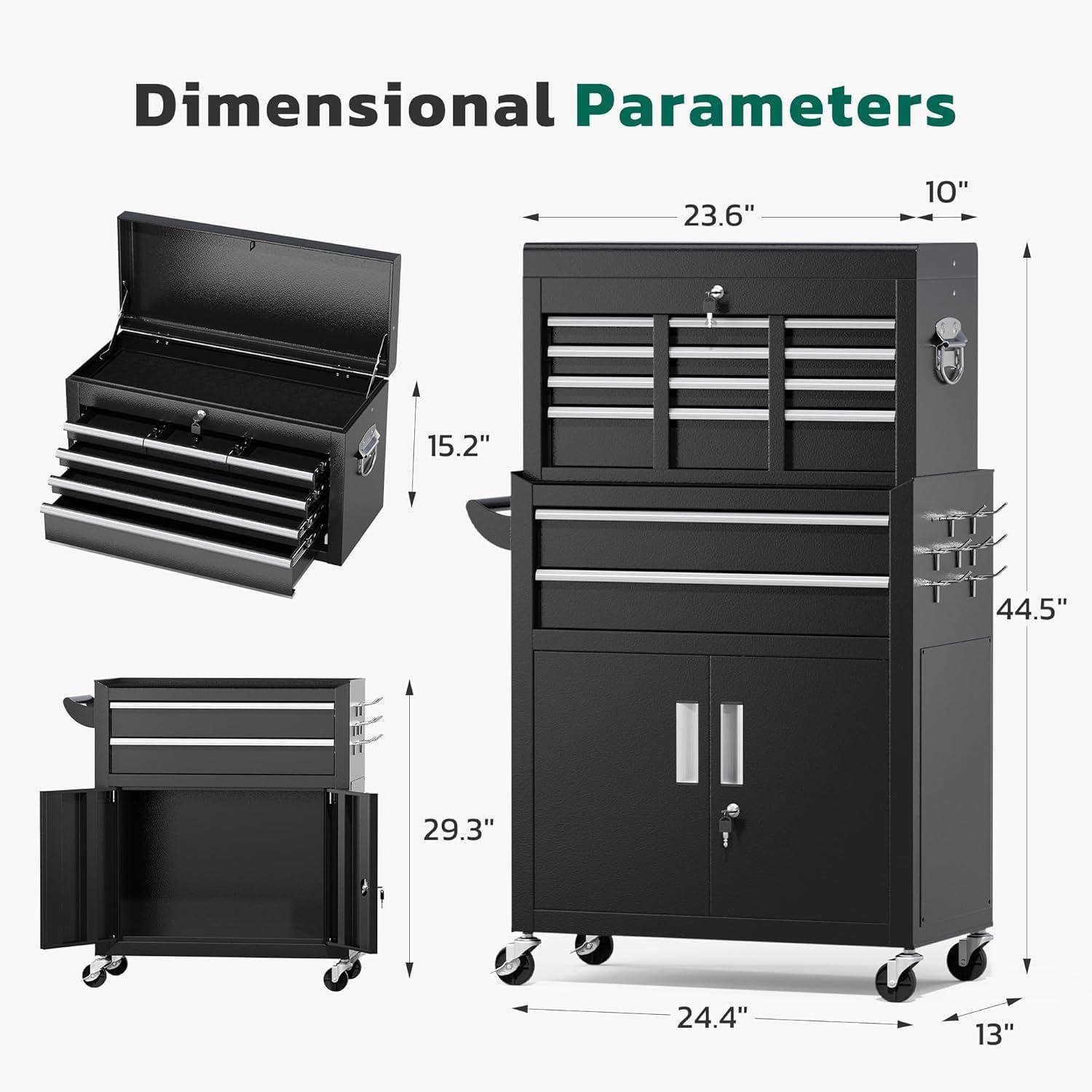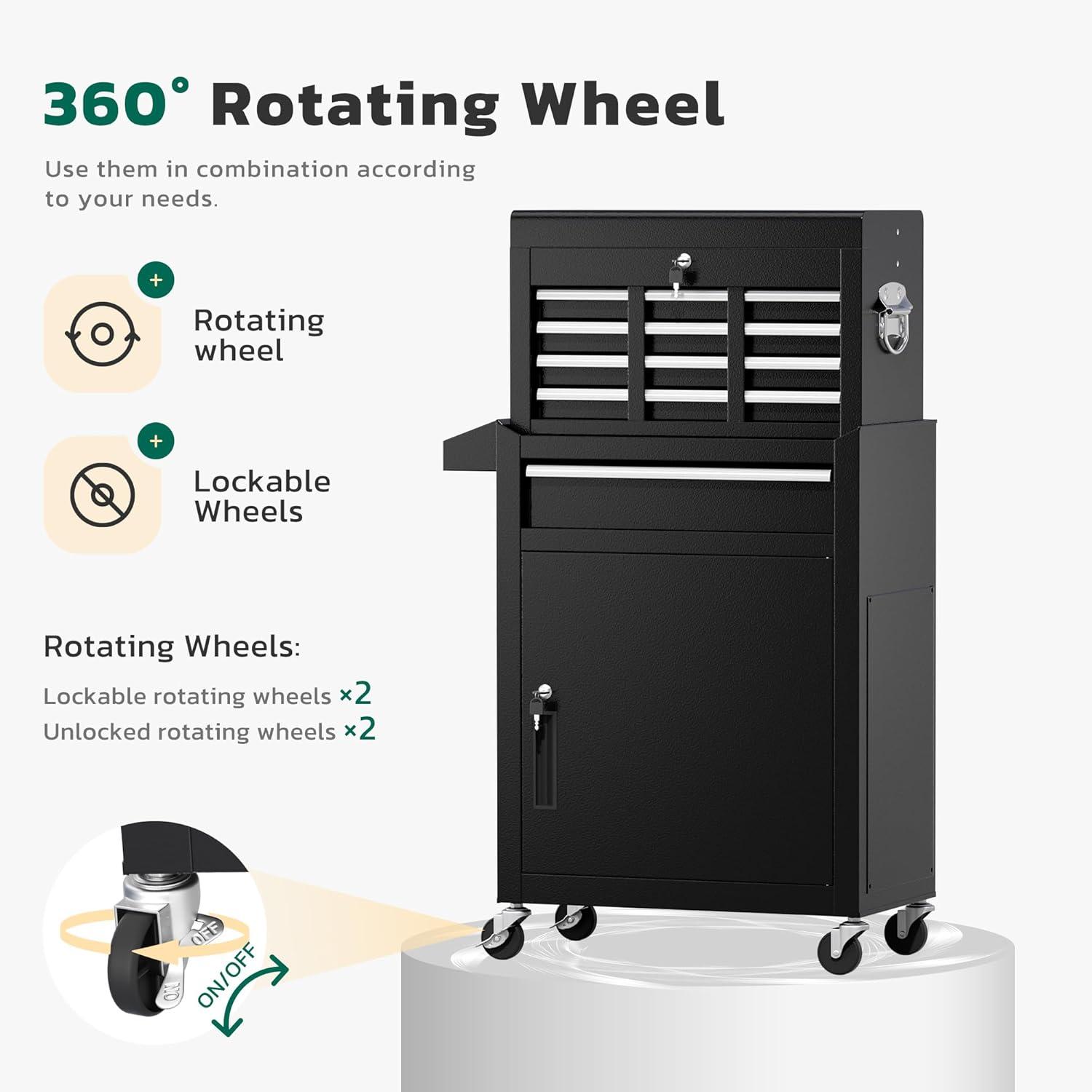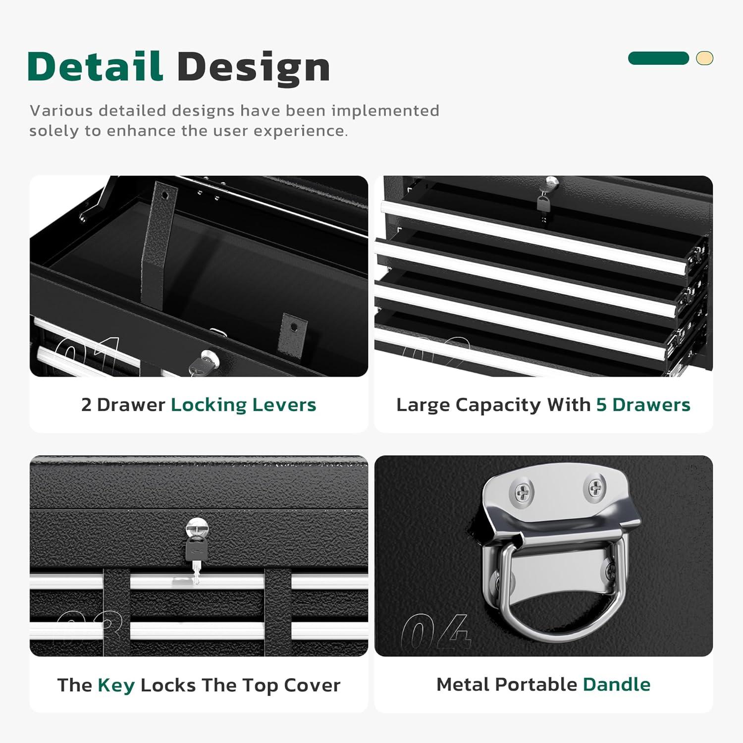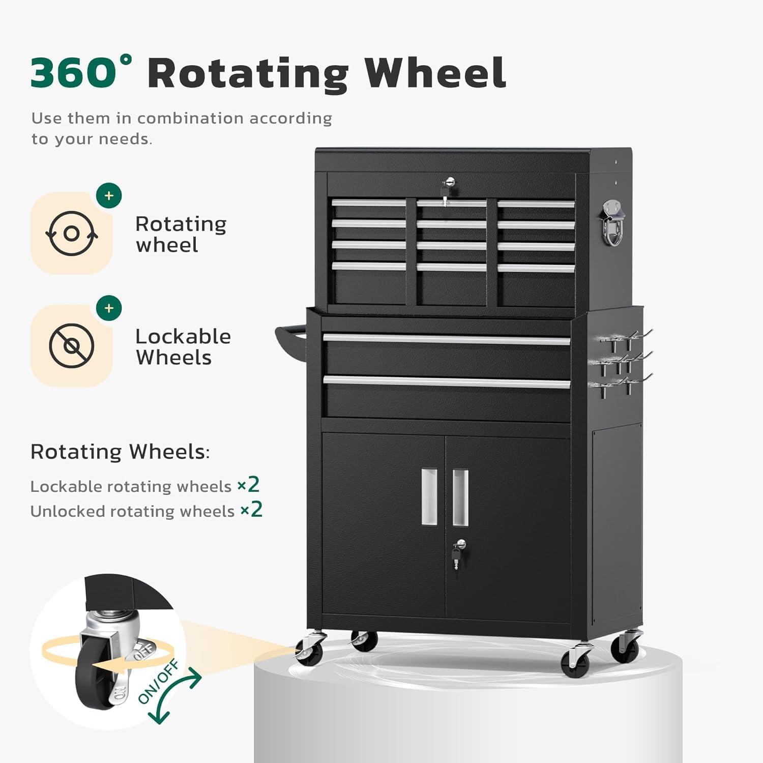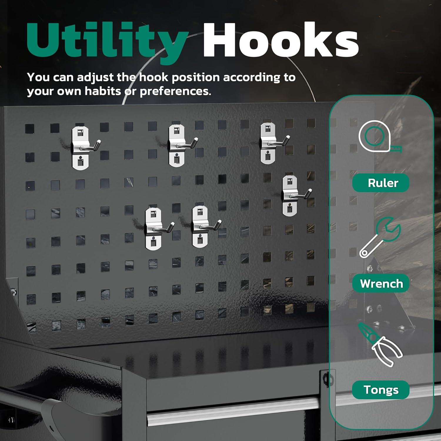 【2 in 1 detachable tool box】Our 5-drawer rolling tool chest can be disassembled into a 5-drawer tool box and a movable storage cabinet. The detachable top tool box can be placed in the lower storage cabinet, and you can use it separately or in combination according to your needs. This Rolling tool box has ample storage capacity and is equipped with adjustable hooks on the sides, providing ample storage space for various tools.