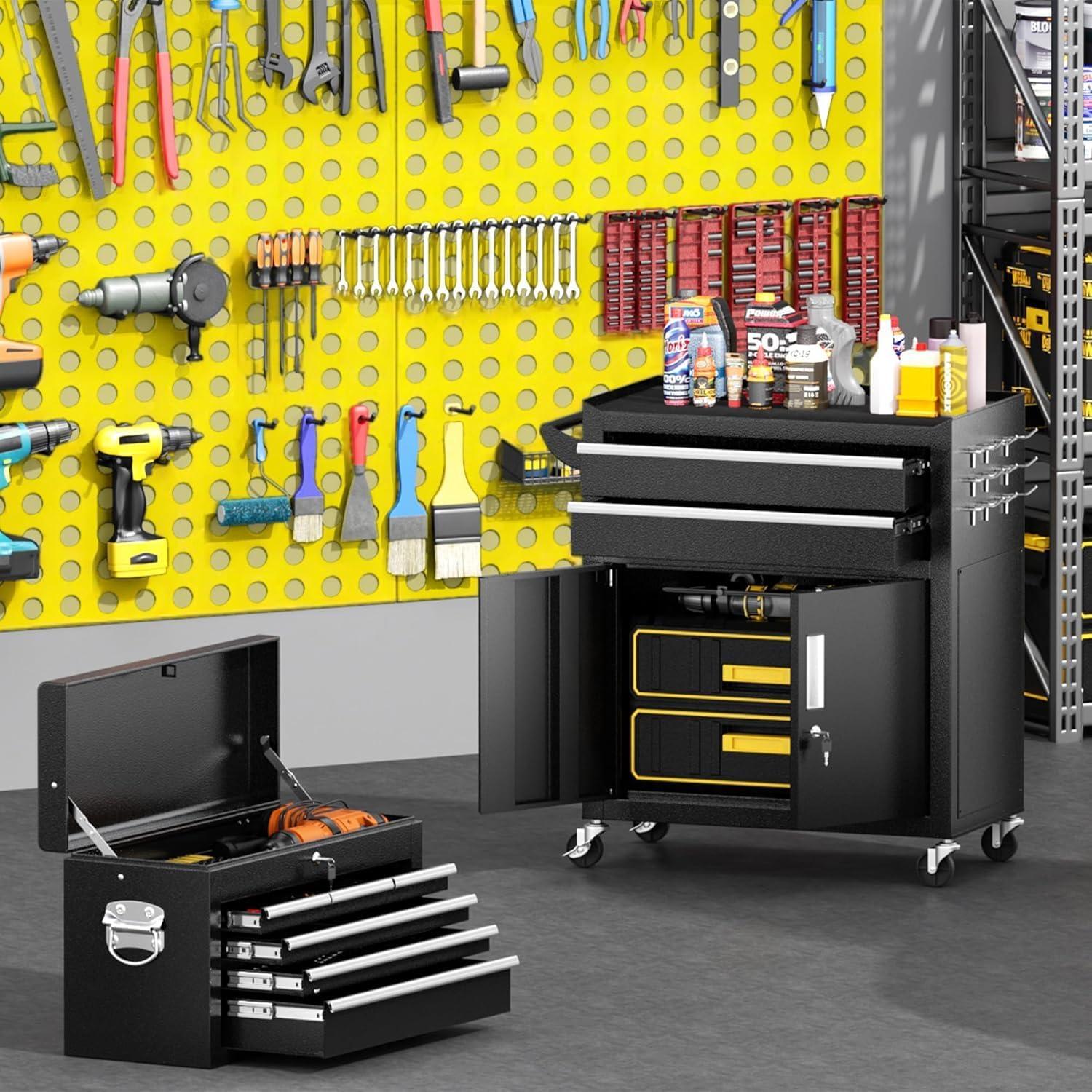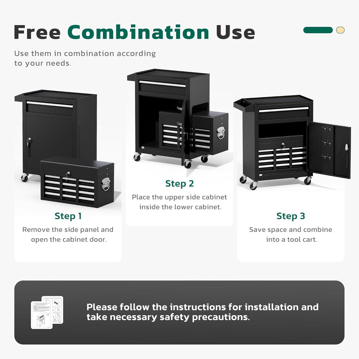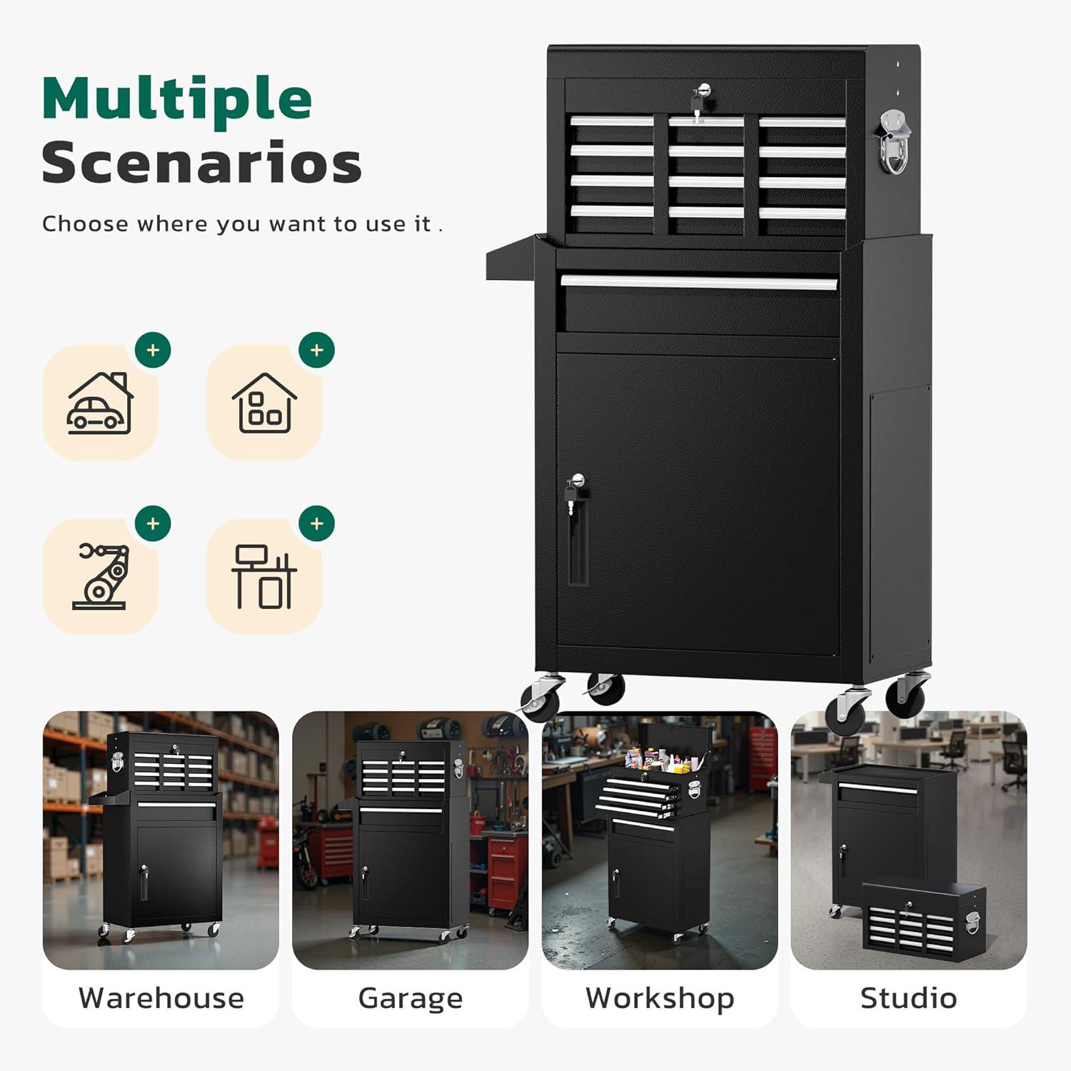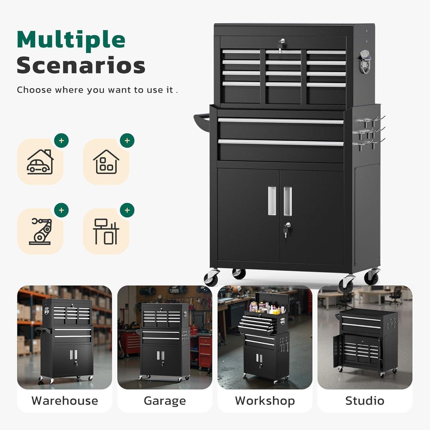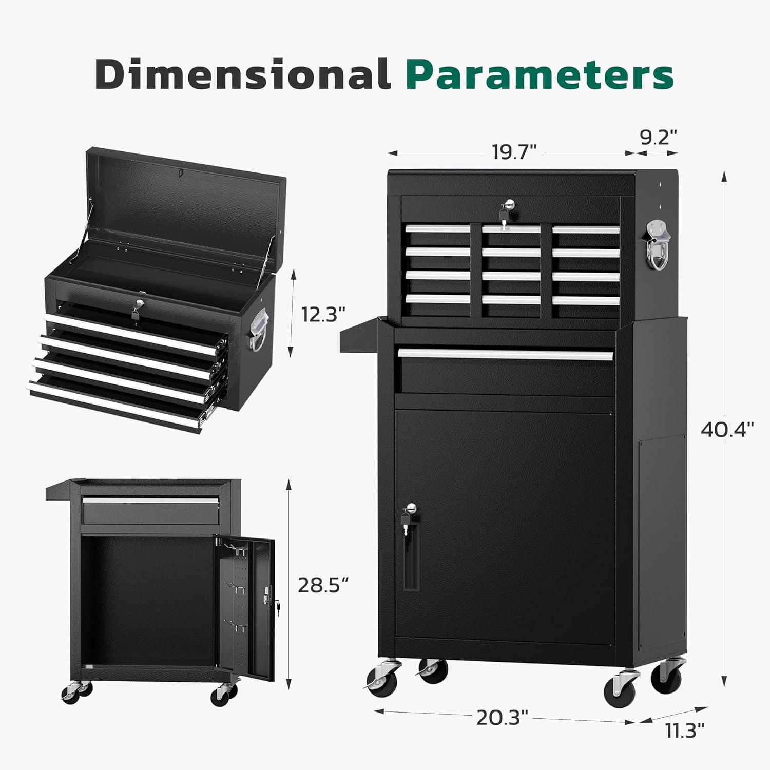 【2 in 1 detachable tool box】Our 5-drawer rolling tool chest can be disassembled into a 5-drawer tool box and a movable storage cabinet. The detachable top tool box can be placed in the lower storage cabinet, and you can use it separately or in combination according to your needs. This Rolling tool box has ample storage capacity and is equipped with adjustable hooks on the sides, providing ample storage space for various tools.