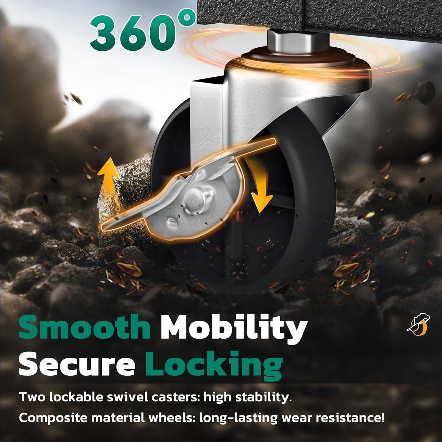 【360°Lockable Wheel & Lock Rod】The tool chest with drawers is equipped with 4 360 ° rollers, two of which are equipped with brake function. When you want to fix the rolling tool box in one position, simply lock the rollers. In addition, two locking rods are designed to prevent drawers from sliding out or cabinet doors from opening during movement.