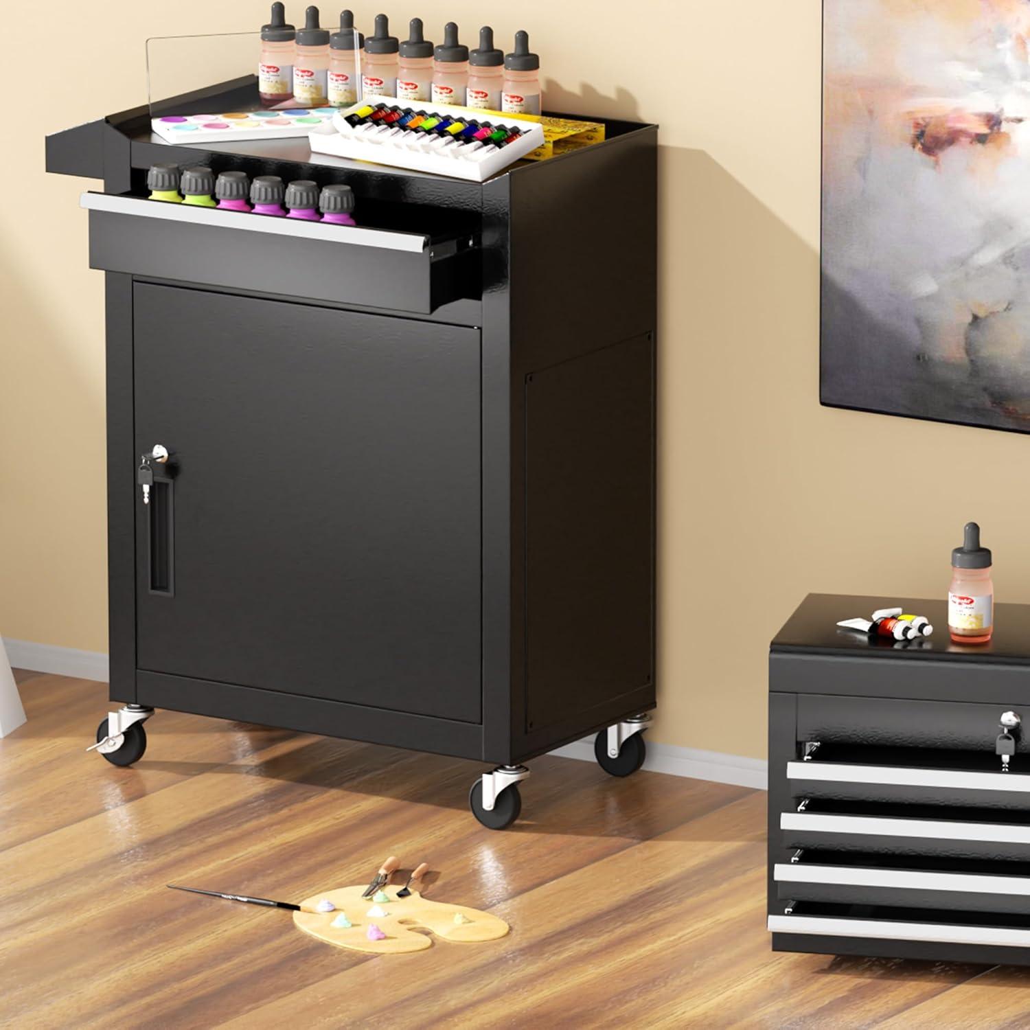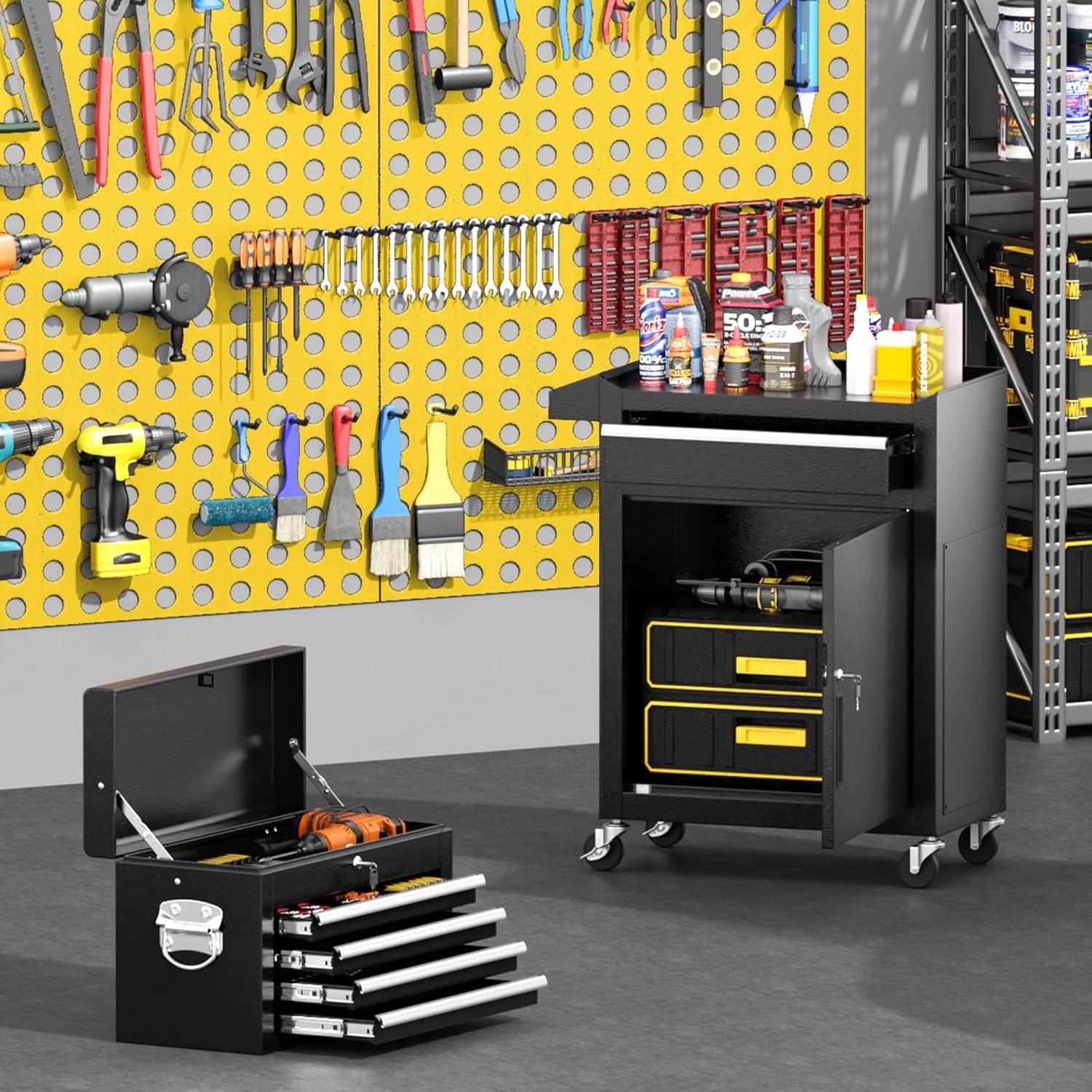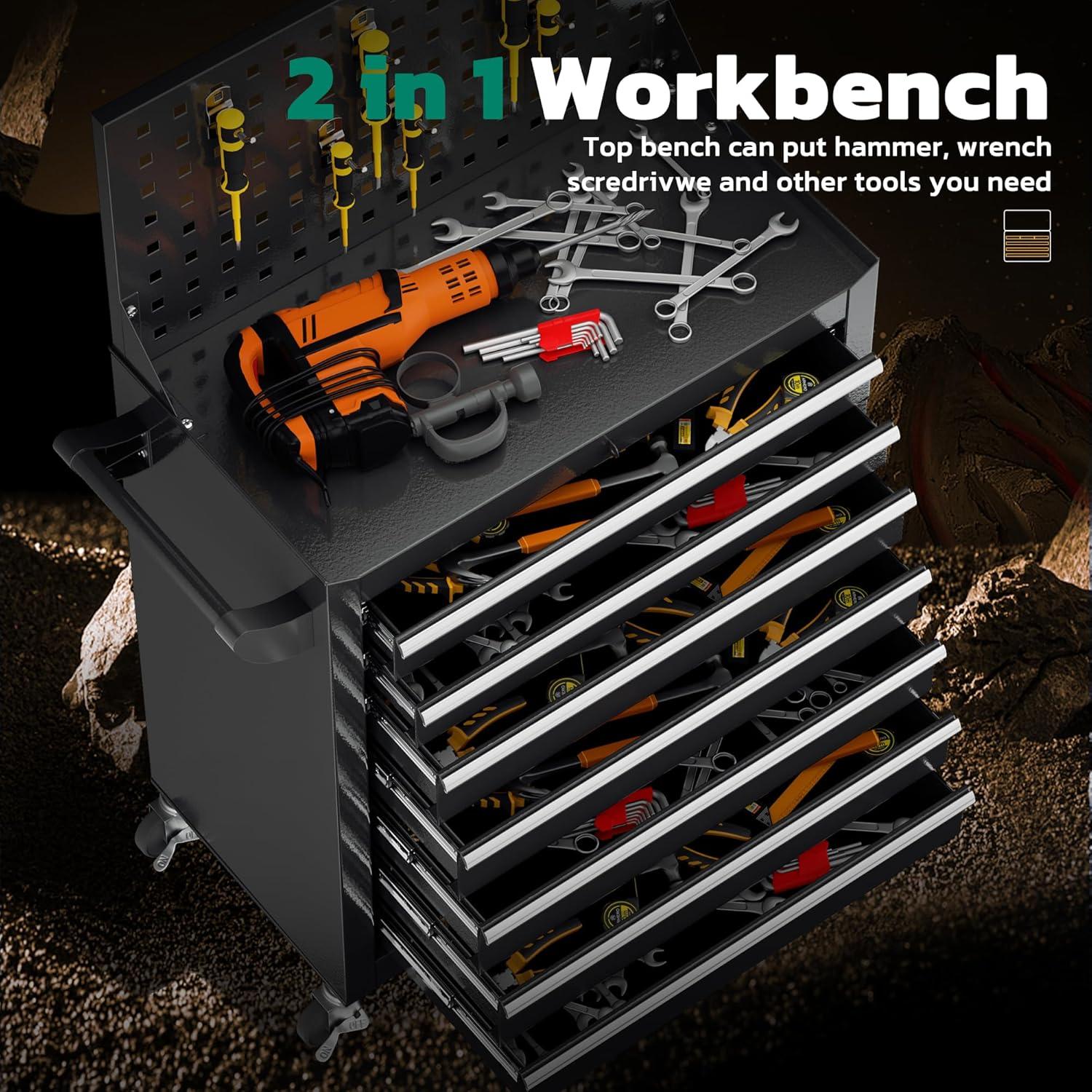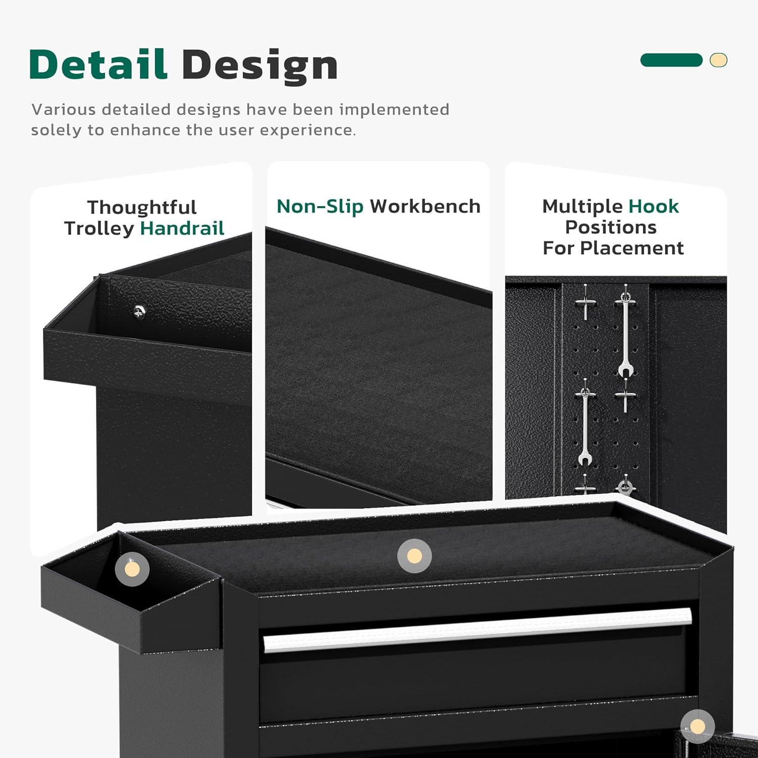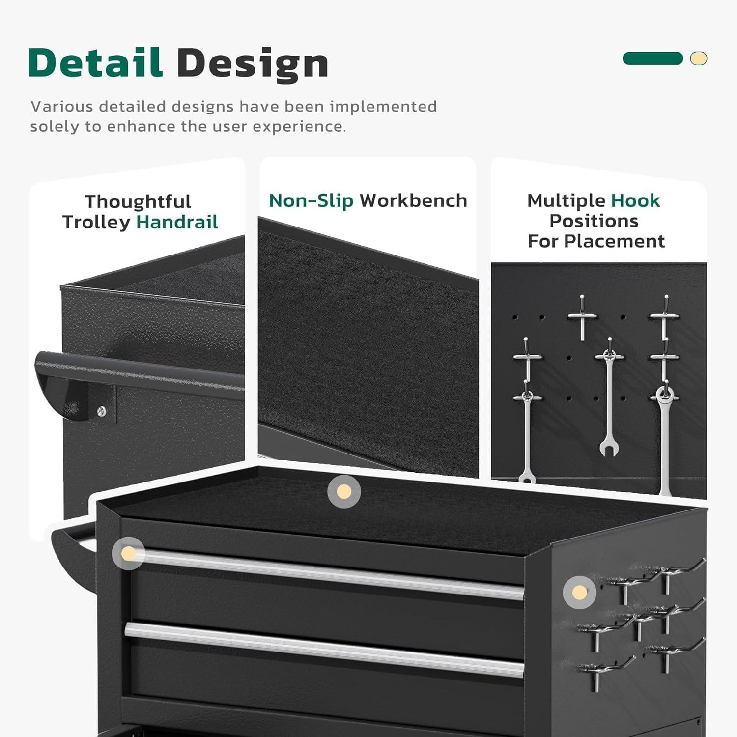 【Large Capacity Storage】The rolling tool chest is equipped with 5 sliding drawers, which can store tools of different sizes. Both the top and bottom layers can store items. The Rolling tool box have 6 hooks next to the cabinet, which can be used to hang tools. The handle design on the side makes it easy for you to move.